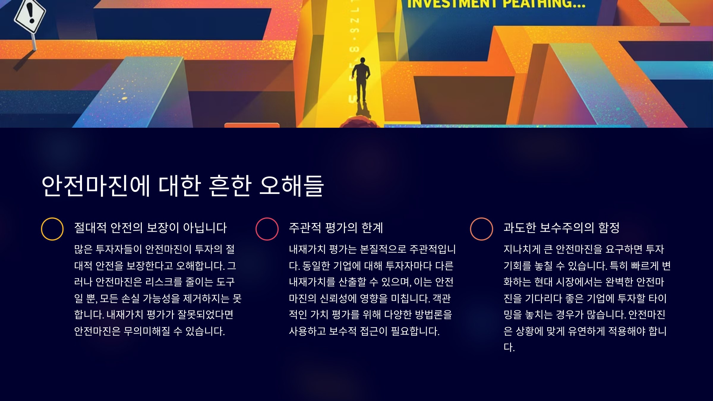 또 하나의 오해는 "내재가치는 내가 정하는 거니까 안전마진도 내가 정하면 돼"라는 논리에요. 하지만 이는 자기 합리화에 불과할 수 있어요. 내재가치 평가가 틀릴 가능성을 감안하는 것이 진짜 안전마진의 핵심이에요.