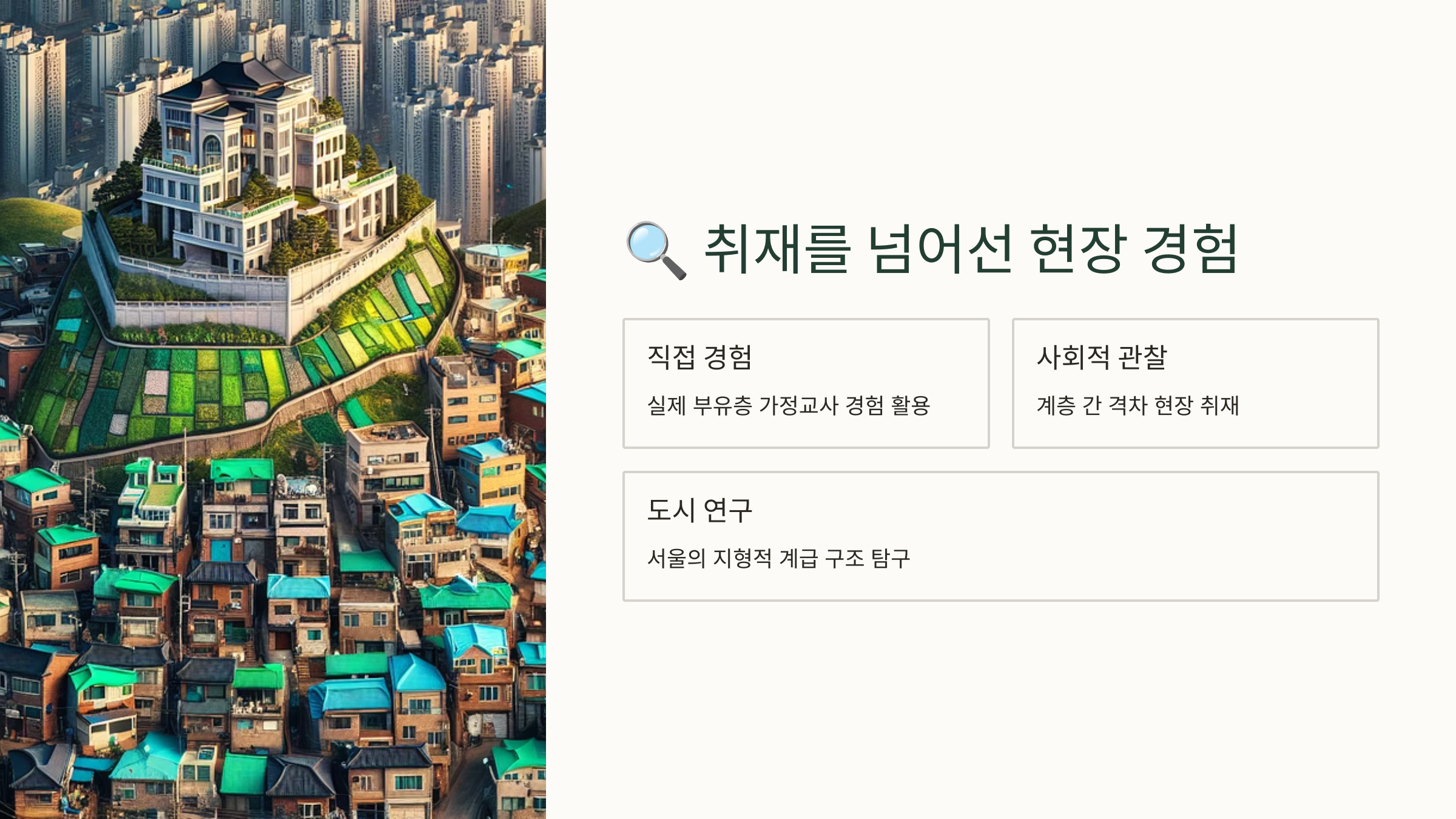 | 성북구 반지하 골목 | 주민 생활 패턴 및 생계 대화 |