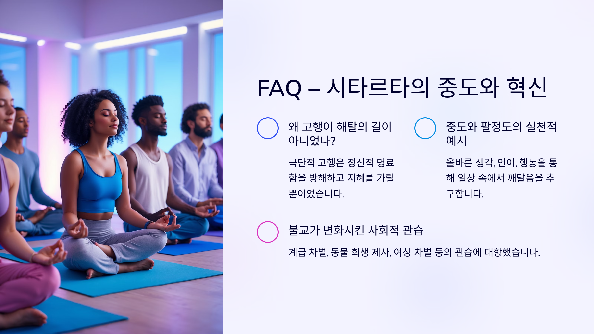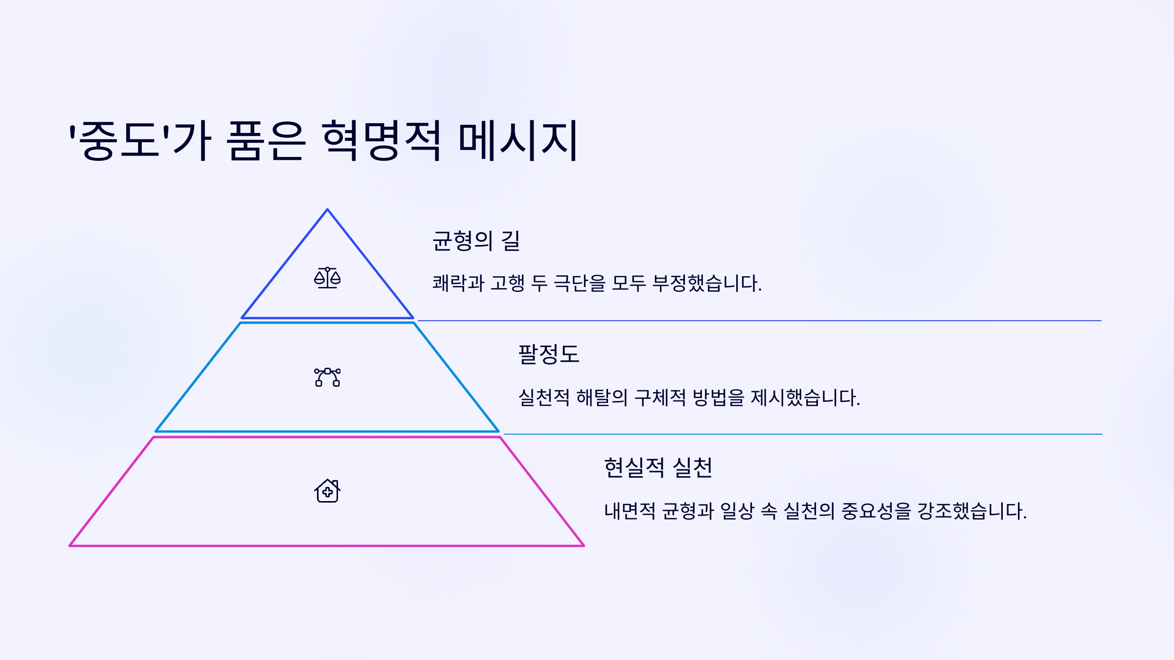 A3. 중도는 단순한 타협이 아니라, 모든 극단적 집착에서 벗어나는 삶의 태도예요. 철학적이면서도 실천적인 개념이에요.