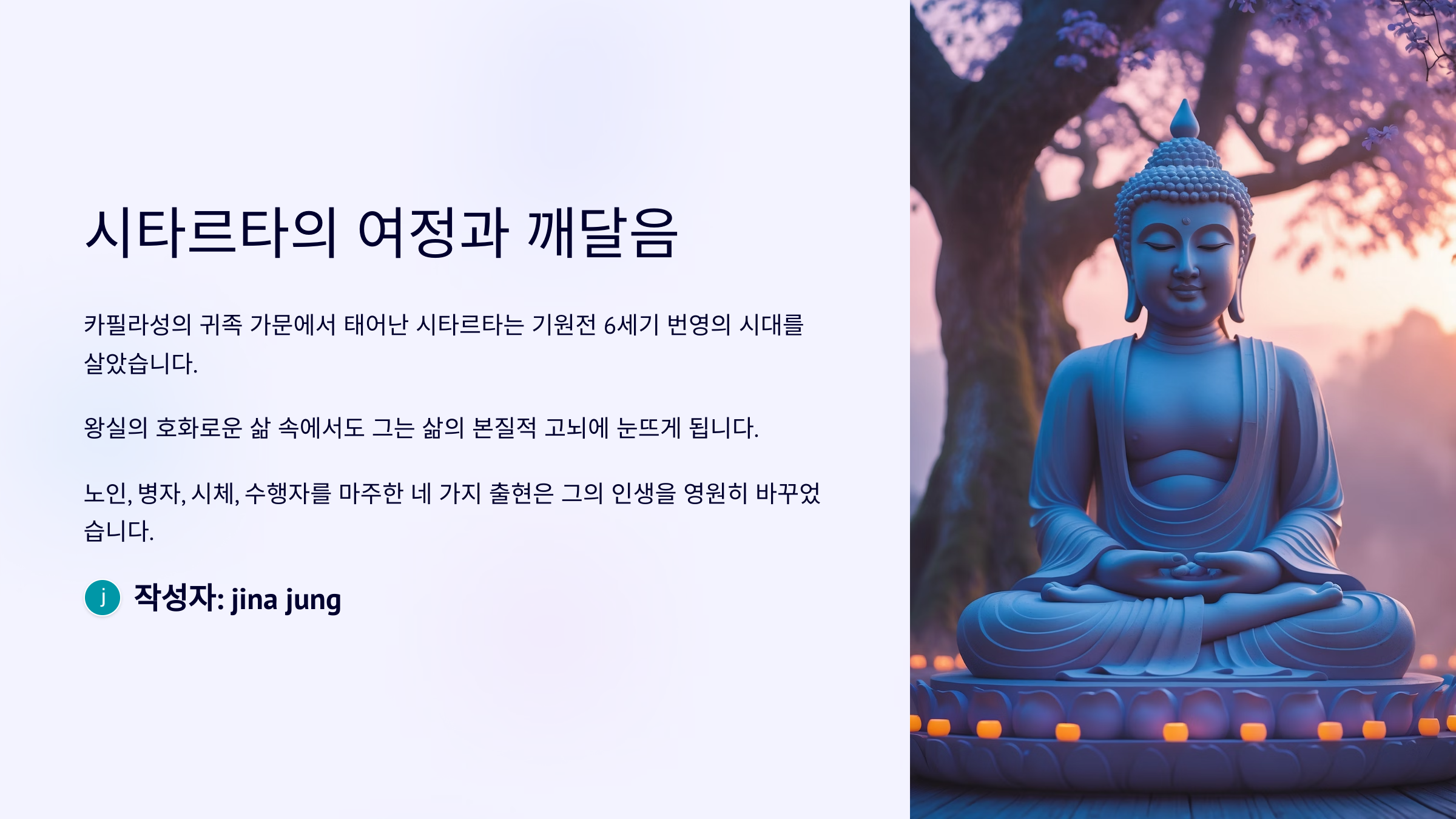 그래서 우리가 오늘날 불교를 접할 때 느끼는 ‘평화로움’이나 ‘비움’의 철학은 단지 종교적 산물이 아니라, 인간 삶에 대한 깊은 이해에서 비롯된 것이에요. 이 모든 뿌리는 시타르타의 통찰로부터 시작된 거죠.