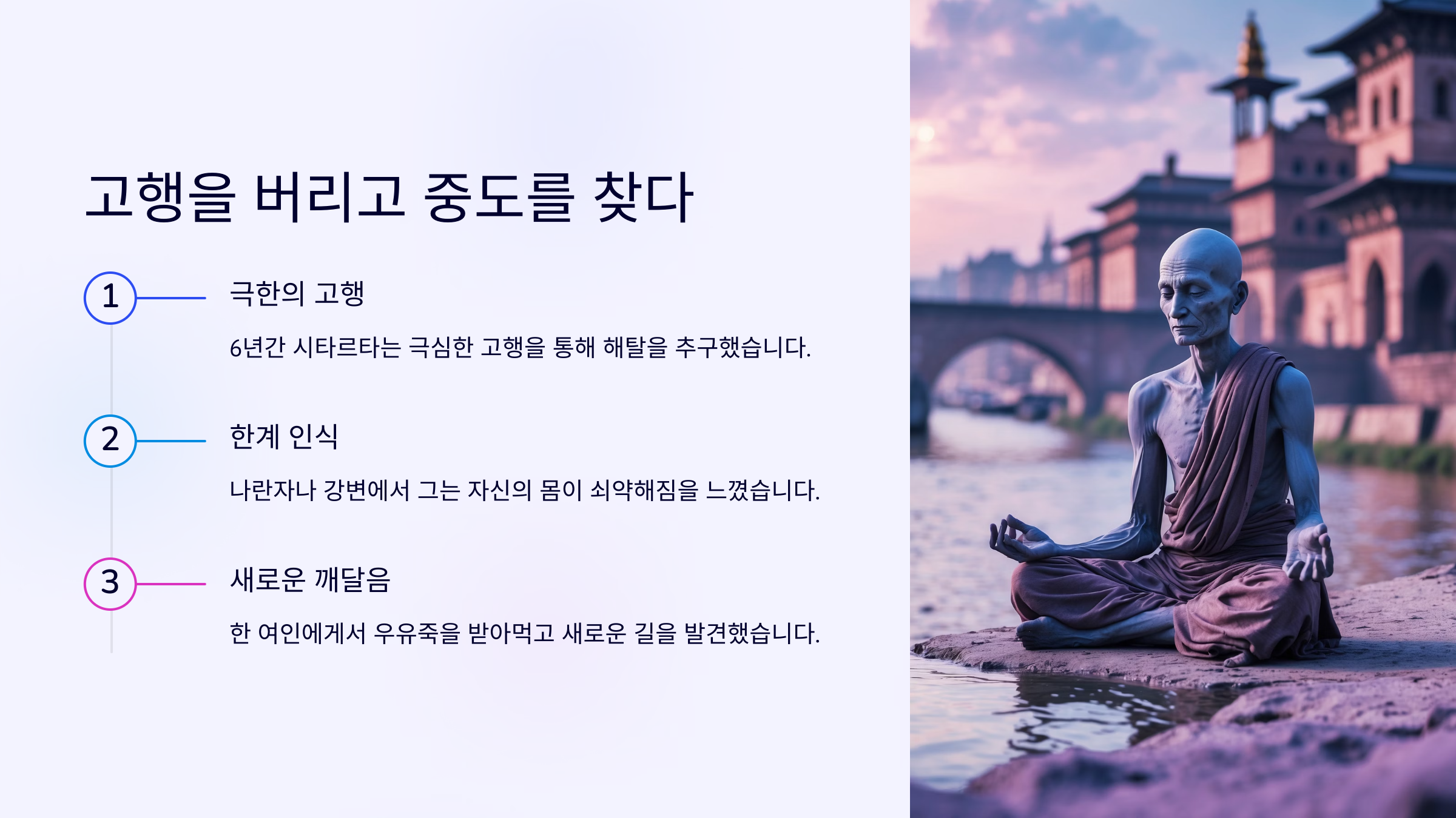 이러한 전환은 시타르타가 단지 철학자나 사상가가 아니라, 실천을 통해 진리를 검증하고 수정한 ‘경험의 인간’이라는 걸 보여줘요. 불교는 이 중도 사상으로 인해 단단한 교리를 갖게 된 거죠.