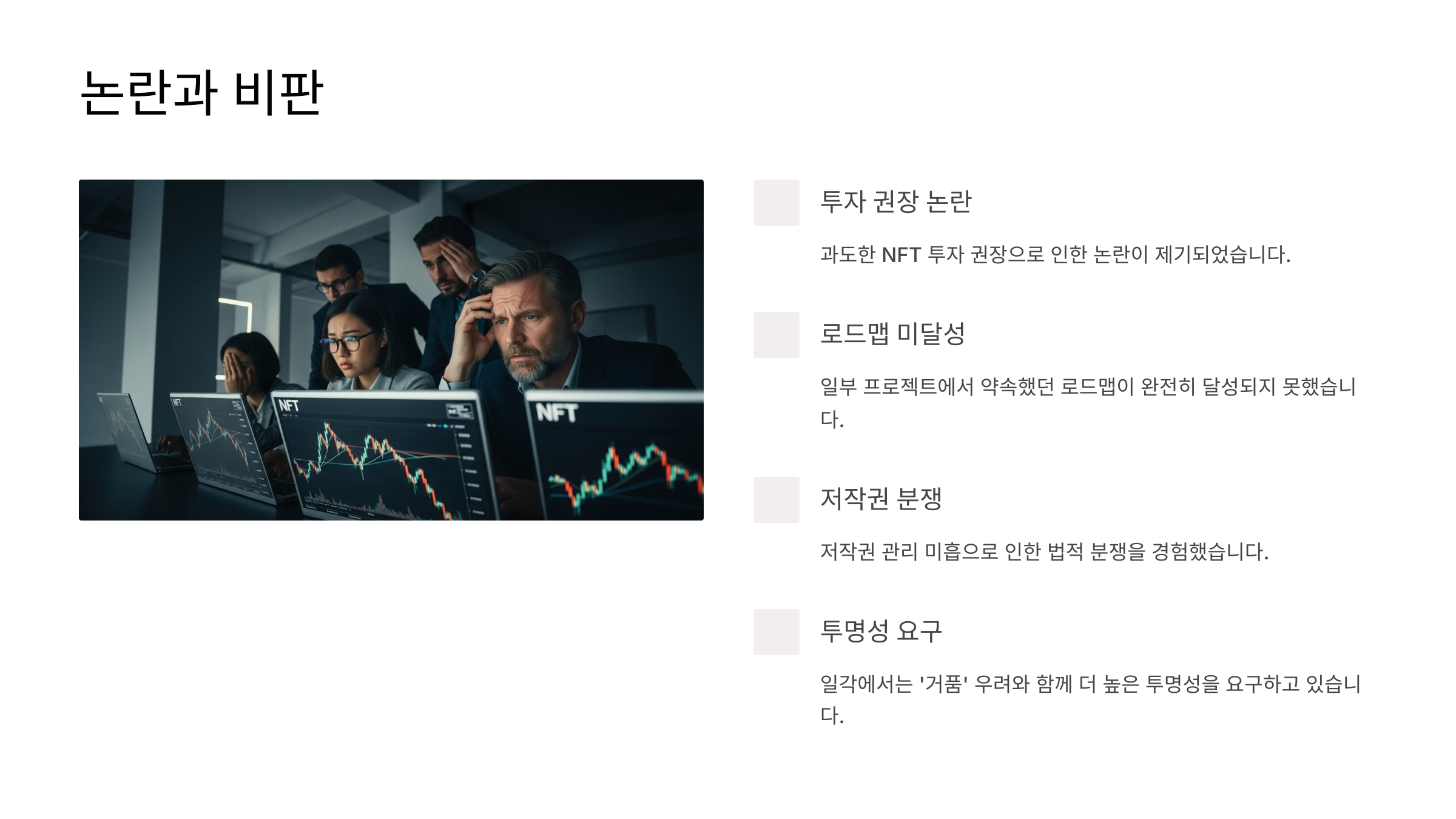 NFT 산업은 여전히 초창기 단계이고, 블루윌도 완벽한 기업은 아니에요. 정상헌 대표와 블루윌이 빠르게 성장한 만큼 여러 논란과 우려도 함께 제기됐어요. 이 중 상당수는 NFT 자체에 대한 부정적 인식과 맞물려 있었고, 일부는 사업 구조나 접근 방식에 대한 근본적인 비판도 있었답니다.