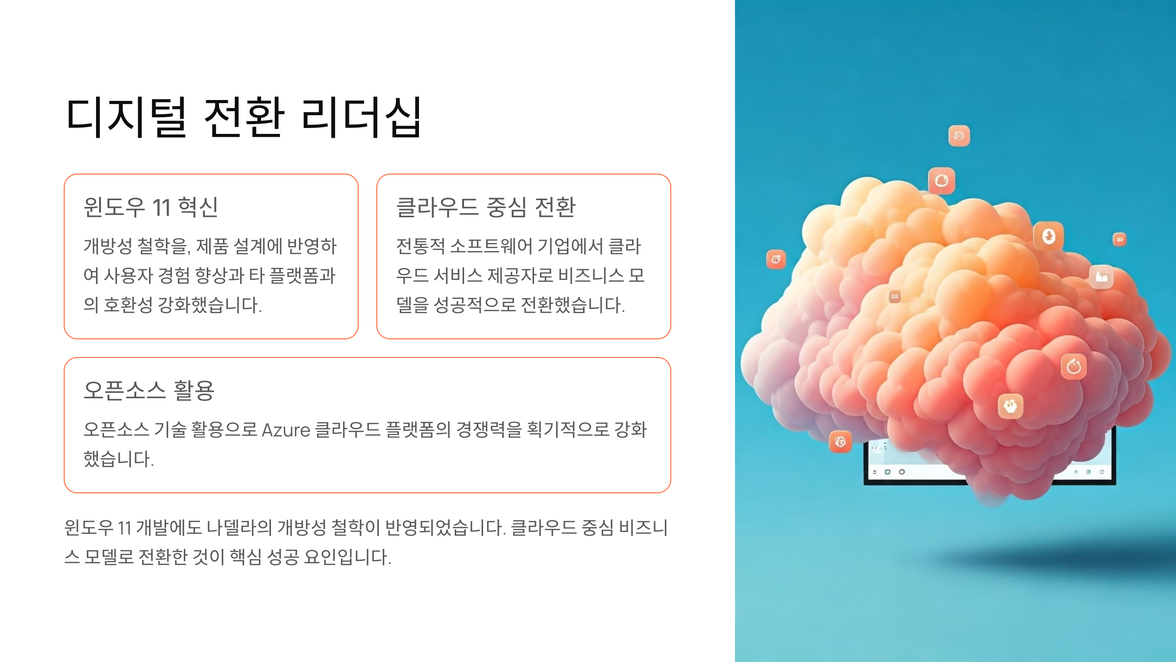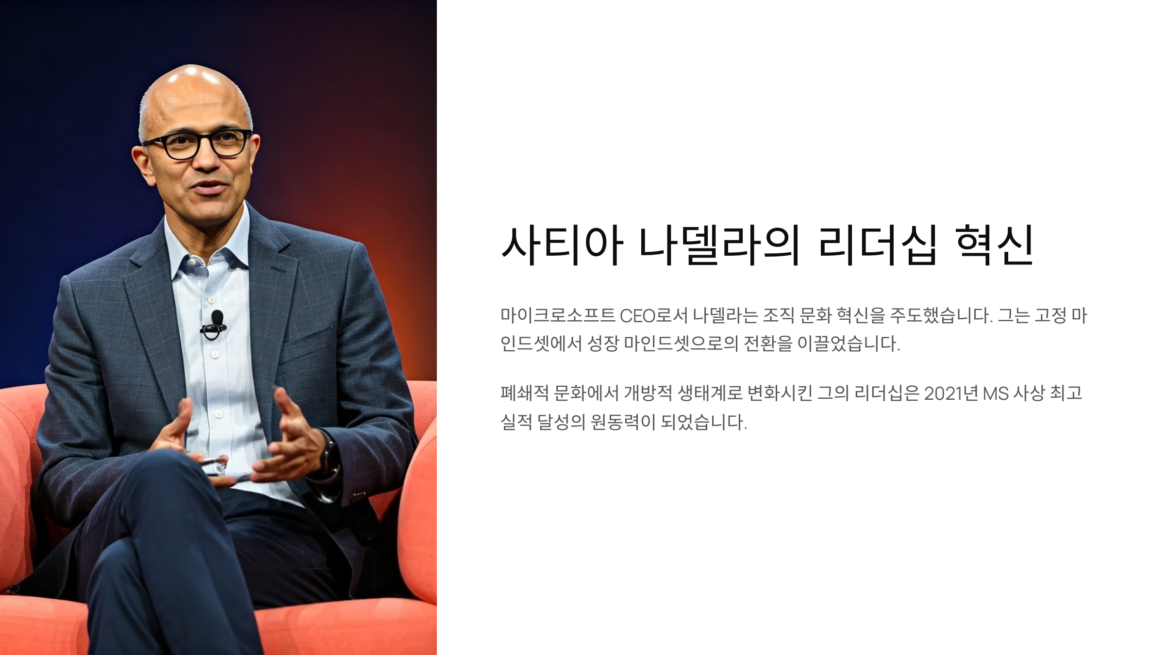 나델라는 마이크로소프트의 문화 자체를 완전히 바꿨어요. 이전엔 경쟁과 통제가 중심이었지만, 지금은 협력과 공유가 중심이에요. 이런 문화가 바로 수익과 연결된다는 점이 핵심이랍니다.