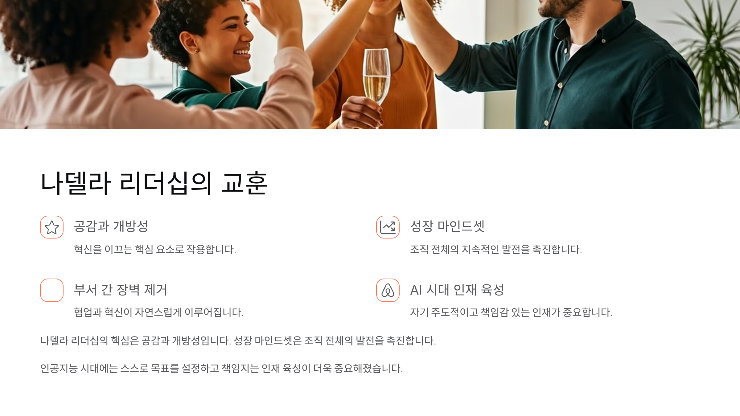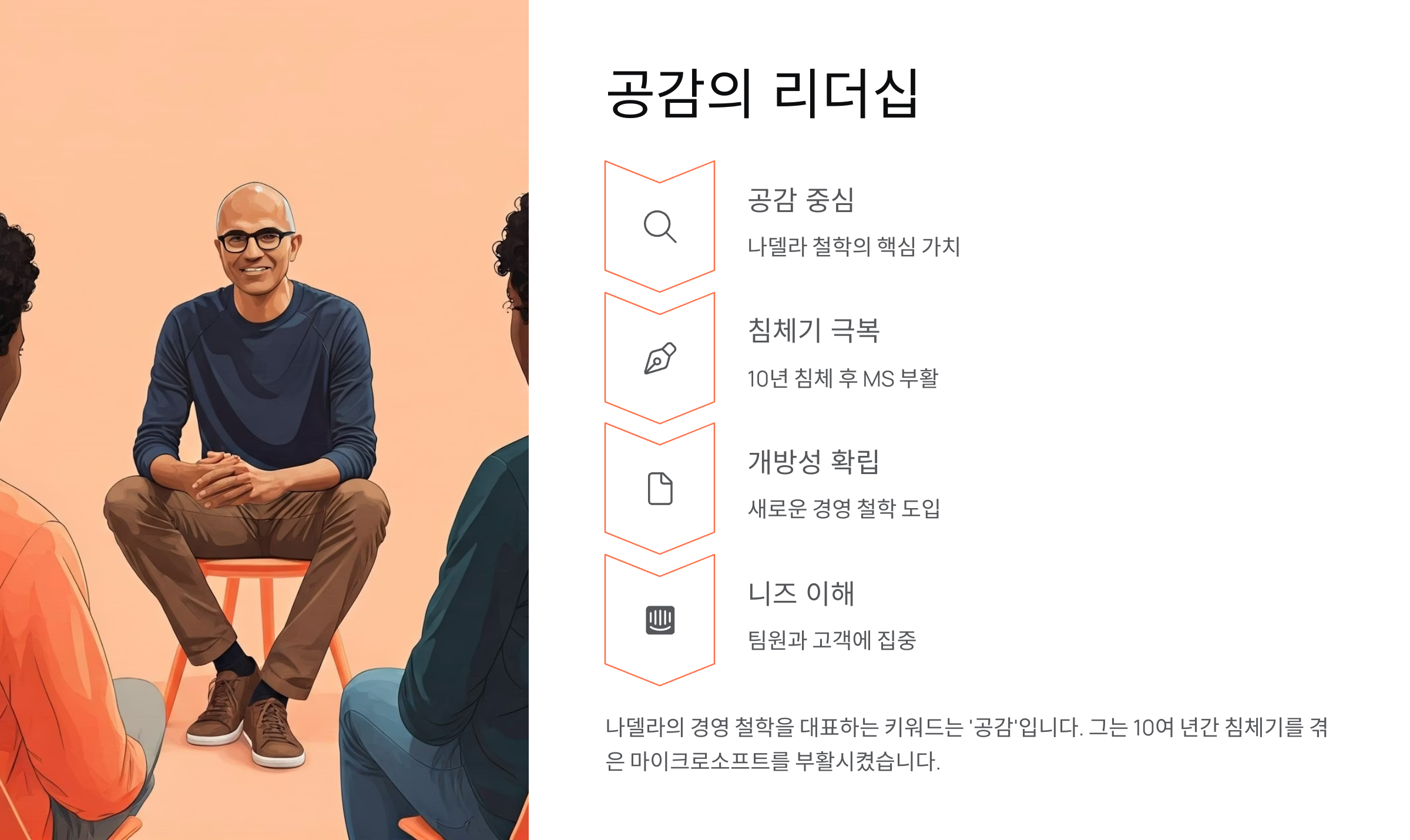 나델라는 ‘경청’이 가장 강력한 무기라고 말해요. 고객을 진심으로 이해하려는 태도가 제품과 서비스의 품질을 끌어올리고, 장기적인 매출 증가로 이어졌어요.
