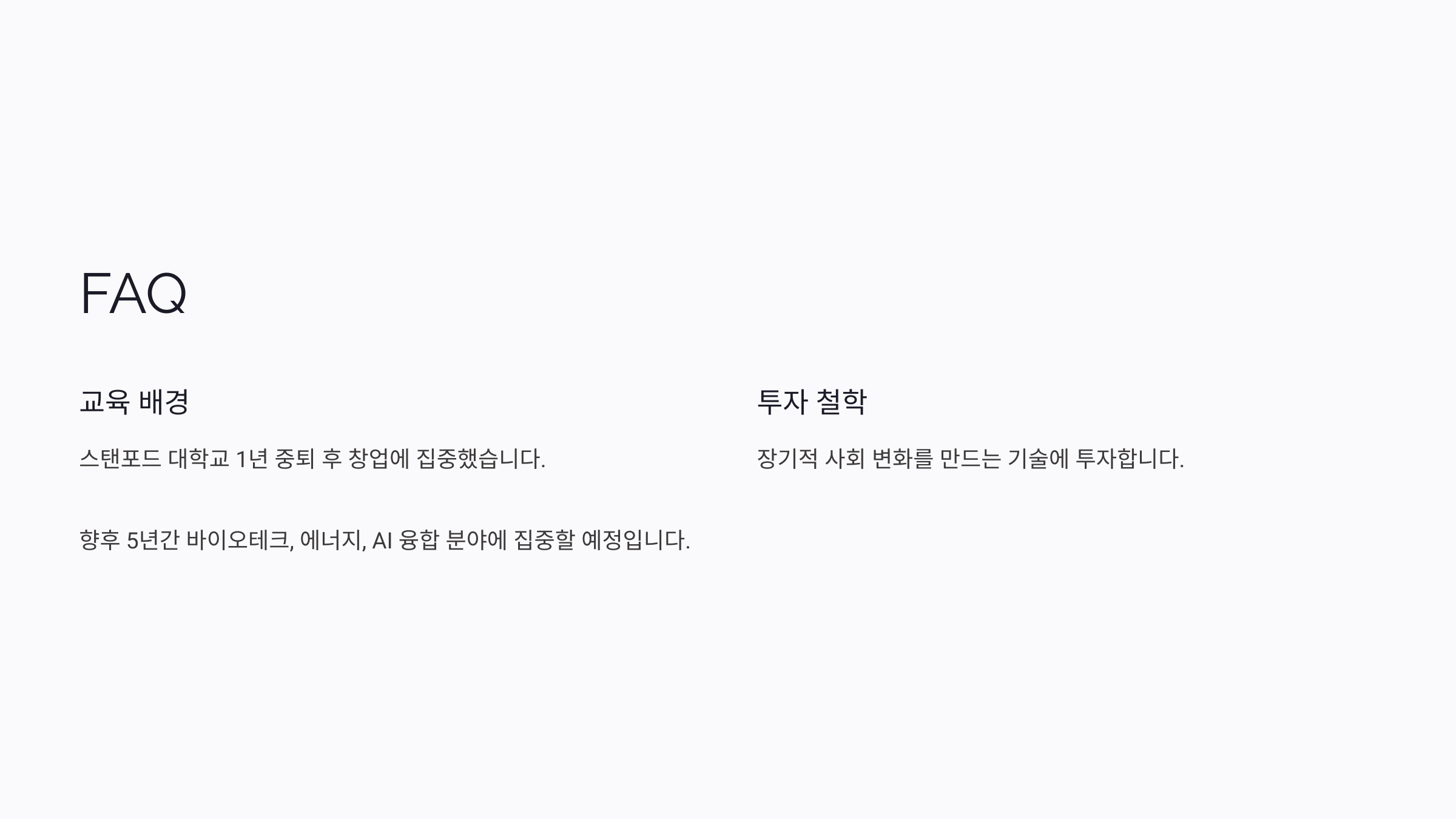 A4. OpenAI, Stripe, Reddit, Airbnb, Oklo 등 다양한 스타트업에 초기 투자한 경험이 있어요. 기술 기반 혁신 기업에 집중하고 있답니다.