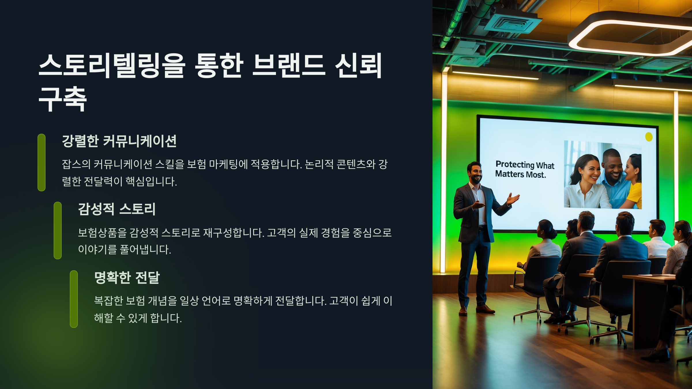스티브 잡스는 제품보다 스토리를 먼저 말했어요. "왜 이 제품이 세상에 필요한가?"를 설득력 있게 전했죠. 보험업계도 지금은 단순히 보장만 설명하는 게 아니라, 고객의 삶에 어떤 가치를 더해줄 수 있는지 이야기를 먼저 꺼내고 있어요.