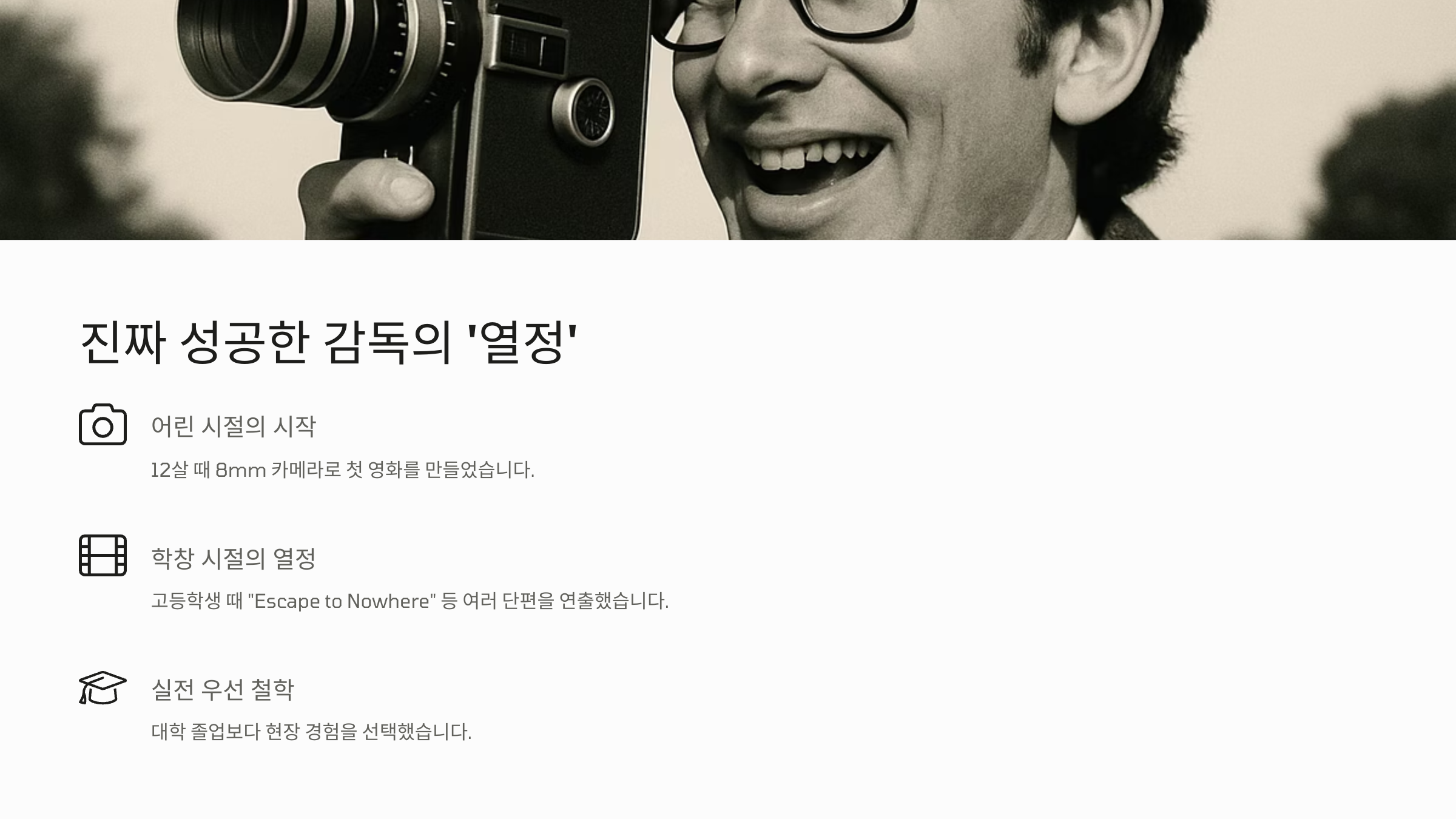 그는 예산이 부족해도, 비판을 받아도, 일이 잘 풀리지 않아도 영화를 계속 만드는 사람을 진짜 감독이라고 말했어요. 열정은 단순히 에너지의 문제가 아니라, 포기하지 않는 태도에서 온다고 강조했죠. 💪