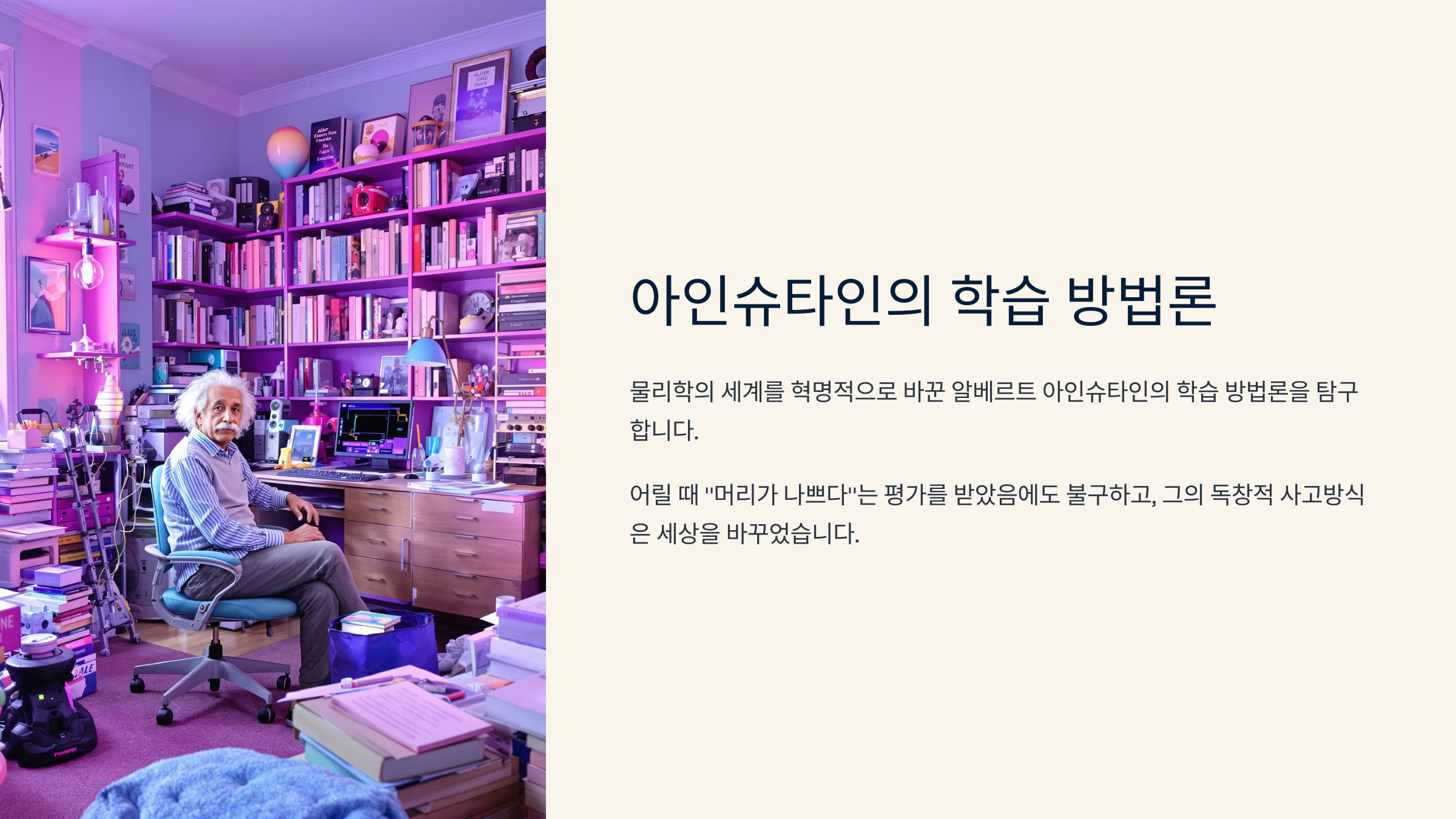 지식을 쌓는 것도 중요하지만, 그것을 ‘어디에’ 쓸 수 있는지를 고민하는 것도 중요해요. 배움이 실천으로 이어질 때 비로소 공부의 의미가 생기니까요. 아인슈타인의 공부법은 이처럼 지식과 현실을 잇는 다리가 되어주었답니다.