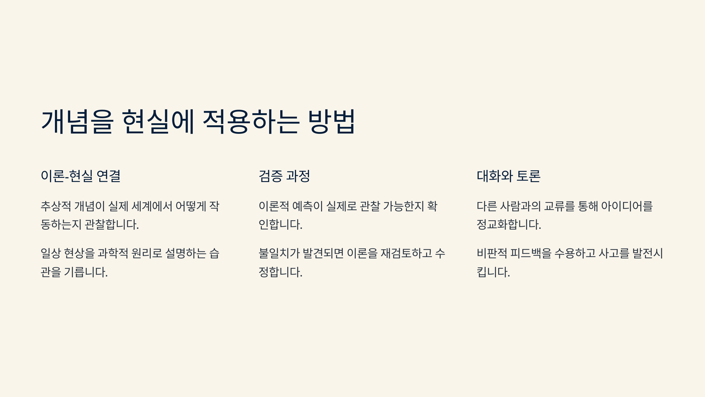 | 이해 중심 | 암기보다 원리를 파악하는 데 집중 |