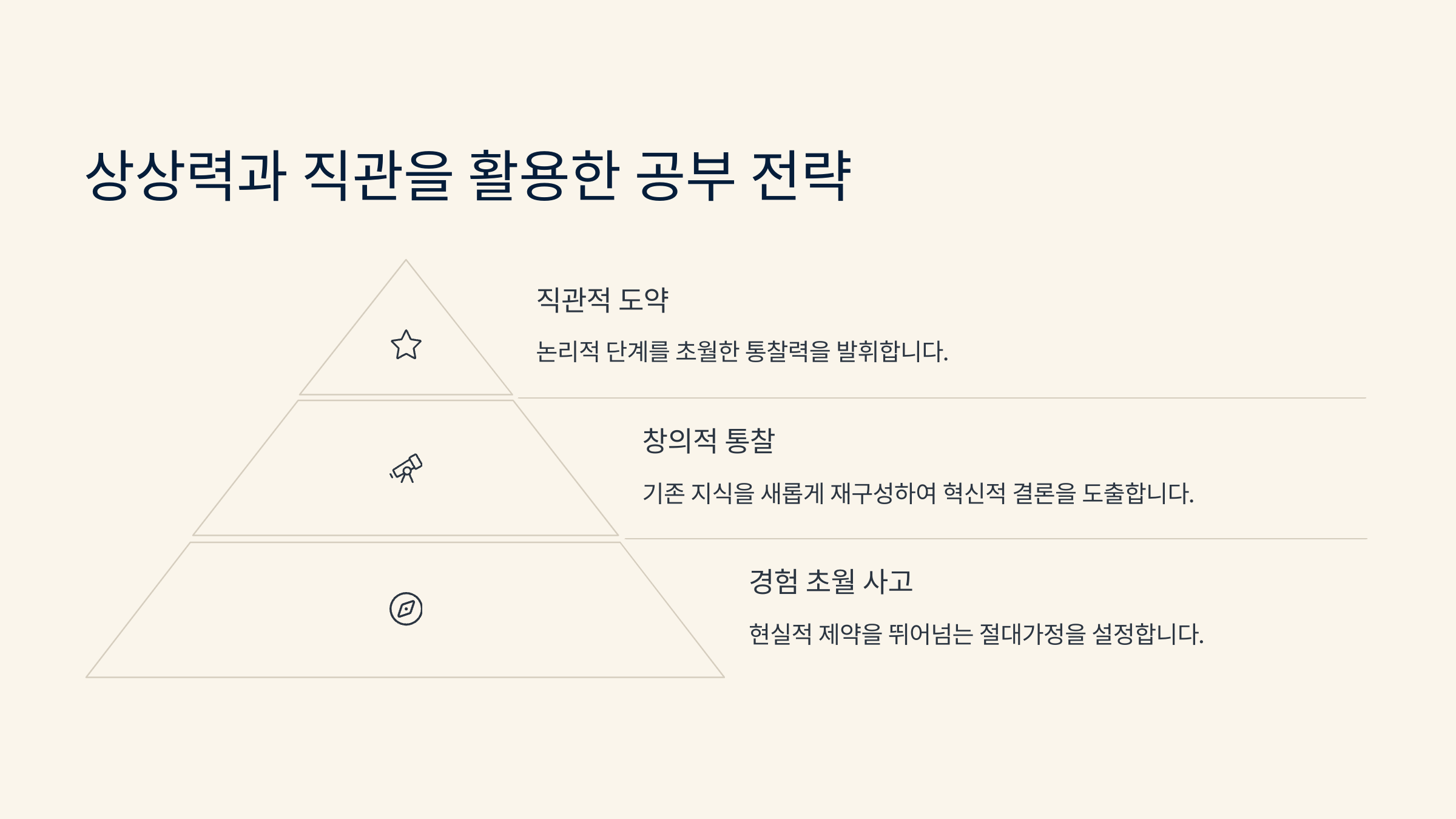 직관 또한 중요한 요소였어요. 아인슈타인은 수많은 수학 공식을 먼저 외우지 않았고, 먼저 개념을 체화한 후 수식으로 정리했어요. 즉, 이론이 먼저가 아니라 '느낌과 사고의 흐름'이 먼저였죠. 이것이 바로 학습에서 '직관이 선행되고 지식이 따라오는' 구조예요.