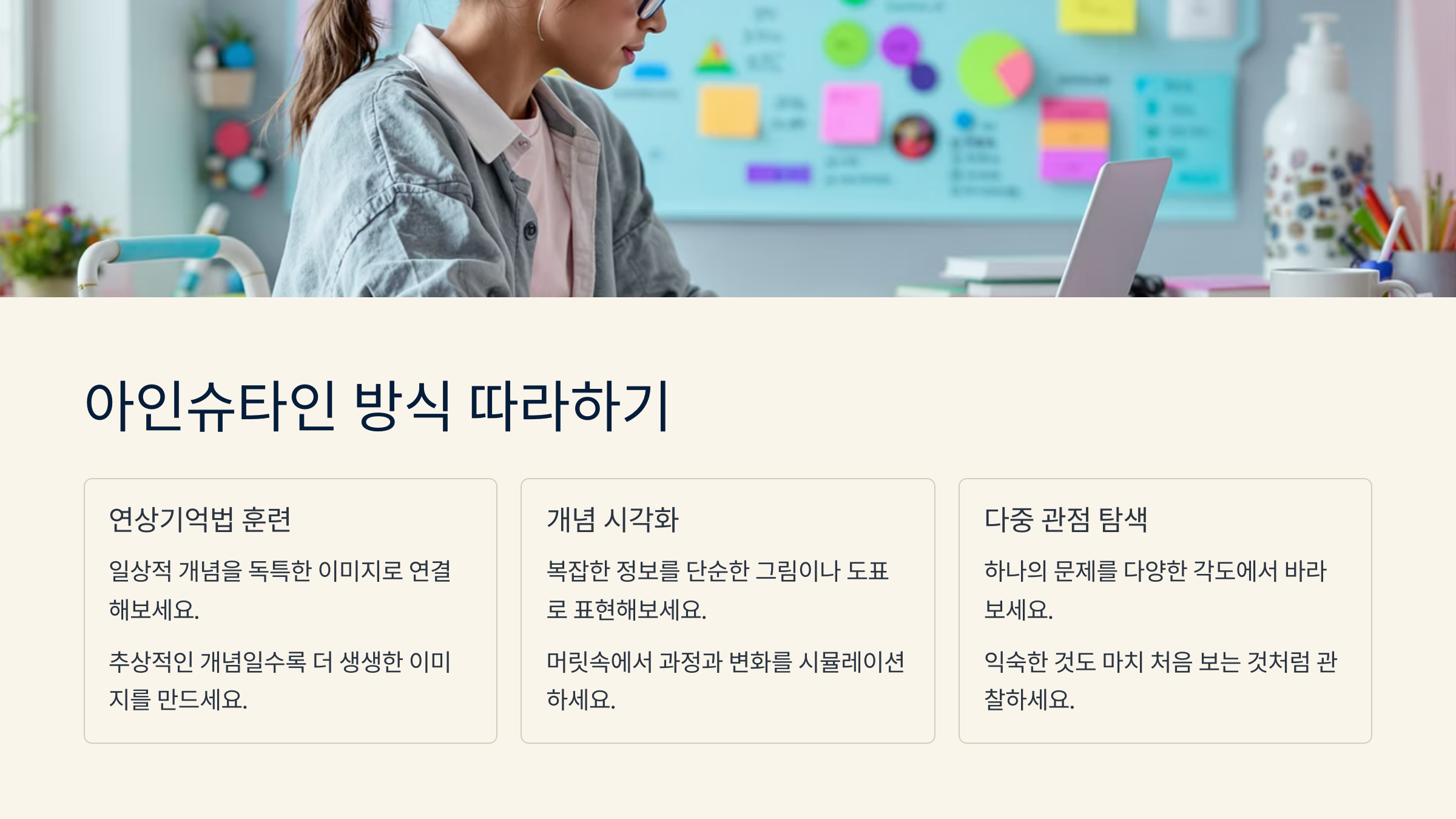 아인슈타인의 철학을 공부에 적용하면, 결과보다 과정에 집중하게 되고 자연스럽게 이해력이 깊어져요. 이건 단순한 스킬이 아니라 '사고 방식의 혁신'이라고 할 수 있어요.