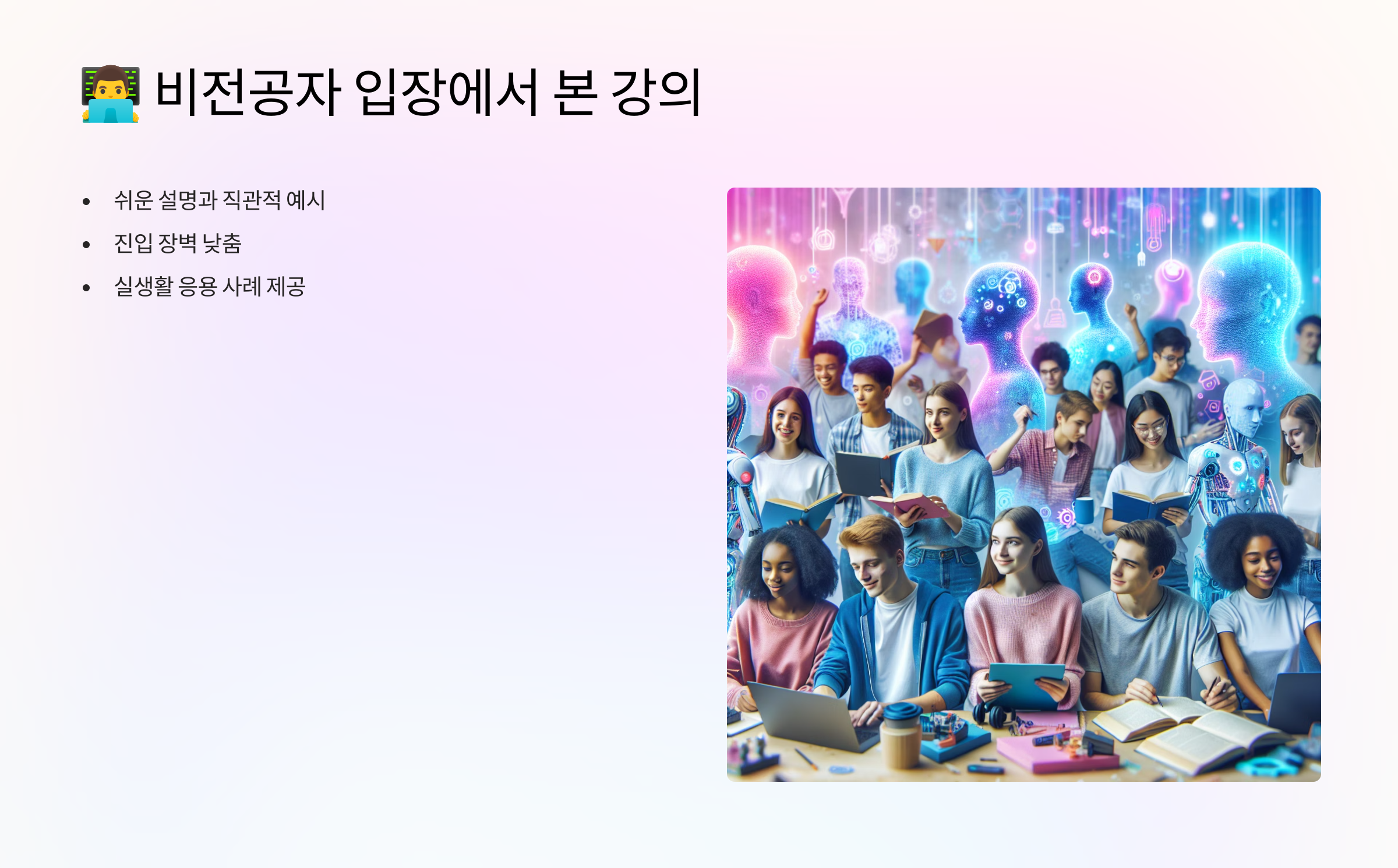 | 비전공자 | 수식보다 개념에 집중하기 |