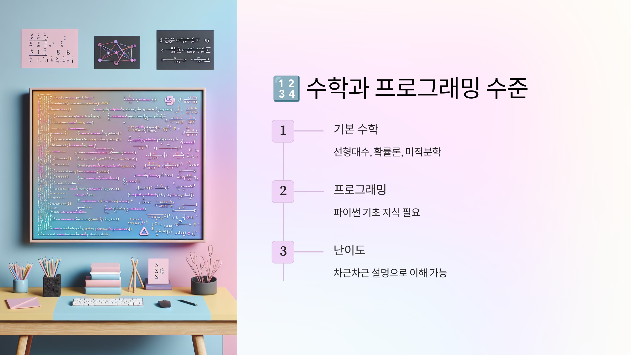 A2. 고등학교 수준의 수학(함수, 미분)과 기본적인 프로그래밍 지식 정도면 충분해요. 특별한 전공 지식은 필요 없어요.