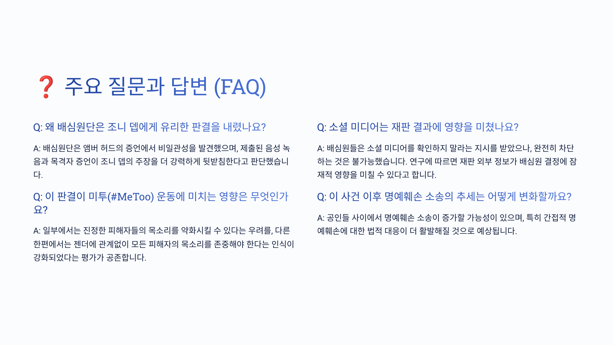A1. 아니에요. 일부 청구에서 승소했지만, 조니 뎁에게도 손해배상을 해야 했기 때문에 양측 모두 일부 승소, 일부 패소한 복합적 결과였어요.