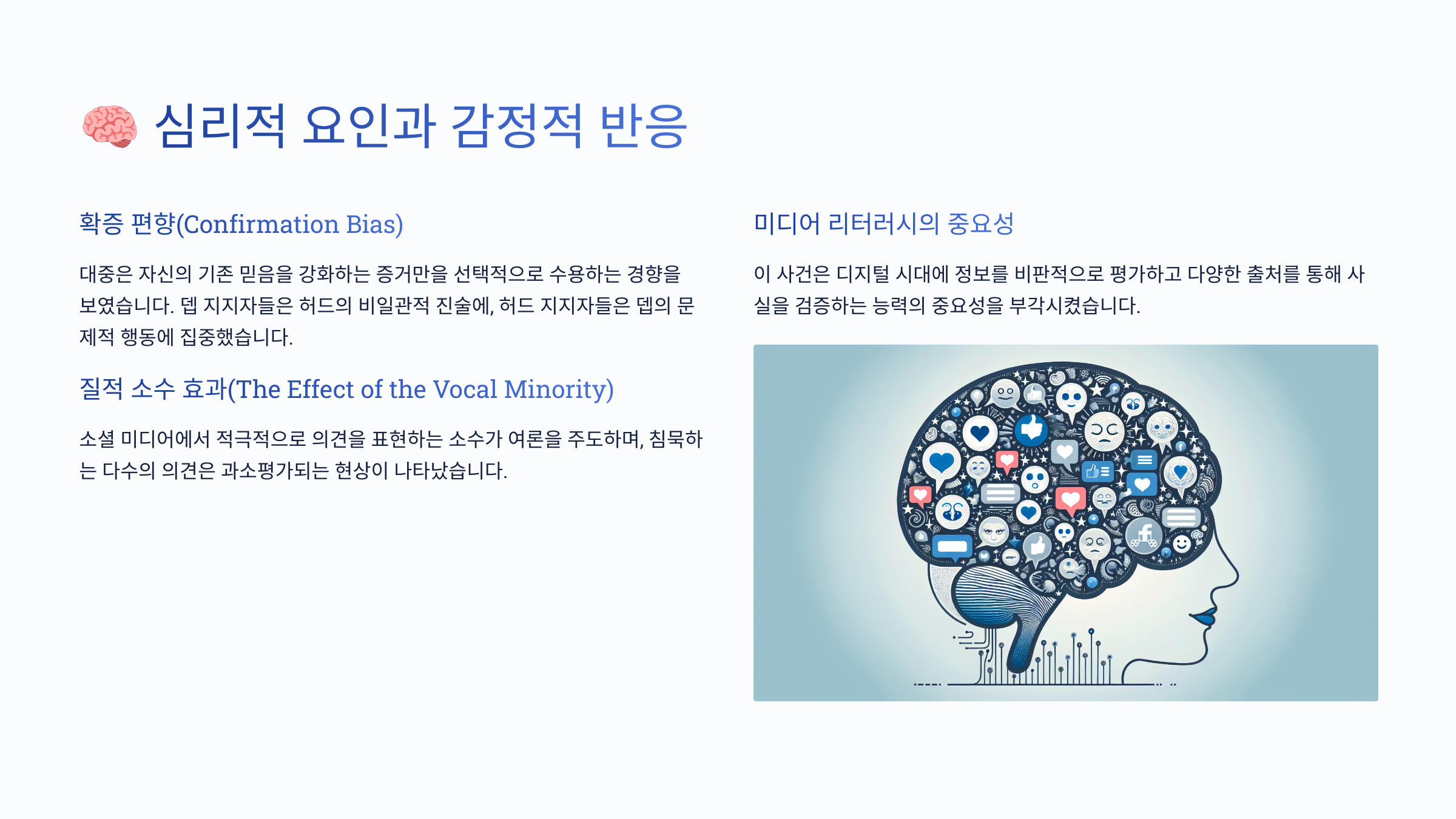 다섯째, ‘집단 동일시’ 현상도 강하게 작용했어요. 사람들은 자신이 속한 커뮤니티나 팬덤의 입장을 무조건 옹호하게 돼요. 조니 뎁 팬들은 조직적으로 정보를 퍼뜨렸고, 그 분위기에 편승하면 자신도 '정의로운 사람'이 되는 듯한 심리적 만족을 얻을 수 있었죠.