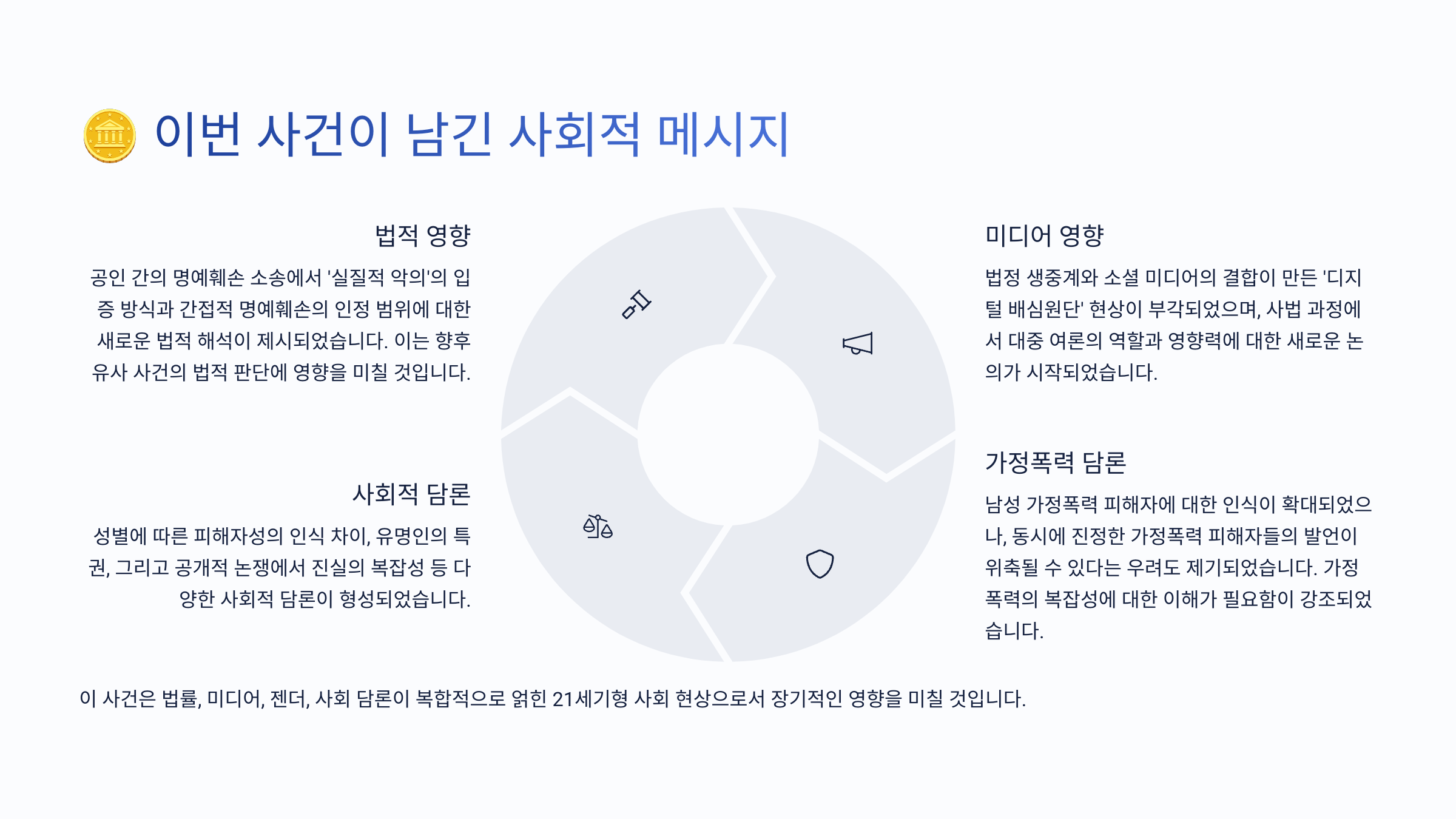 이런 흐름은 개인의 명예뿐 아니라 사회 전체의 신뢰 구조에도 영향을 줬어요. 여론이 쉽게 확정 짓는 ‘가해자’와 ‘피해자’ 프레임은 종종 진실을 왜곡하고, 개인을 파괴하는 데까지 이어지게 돼요.