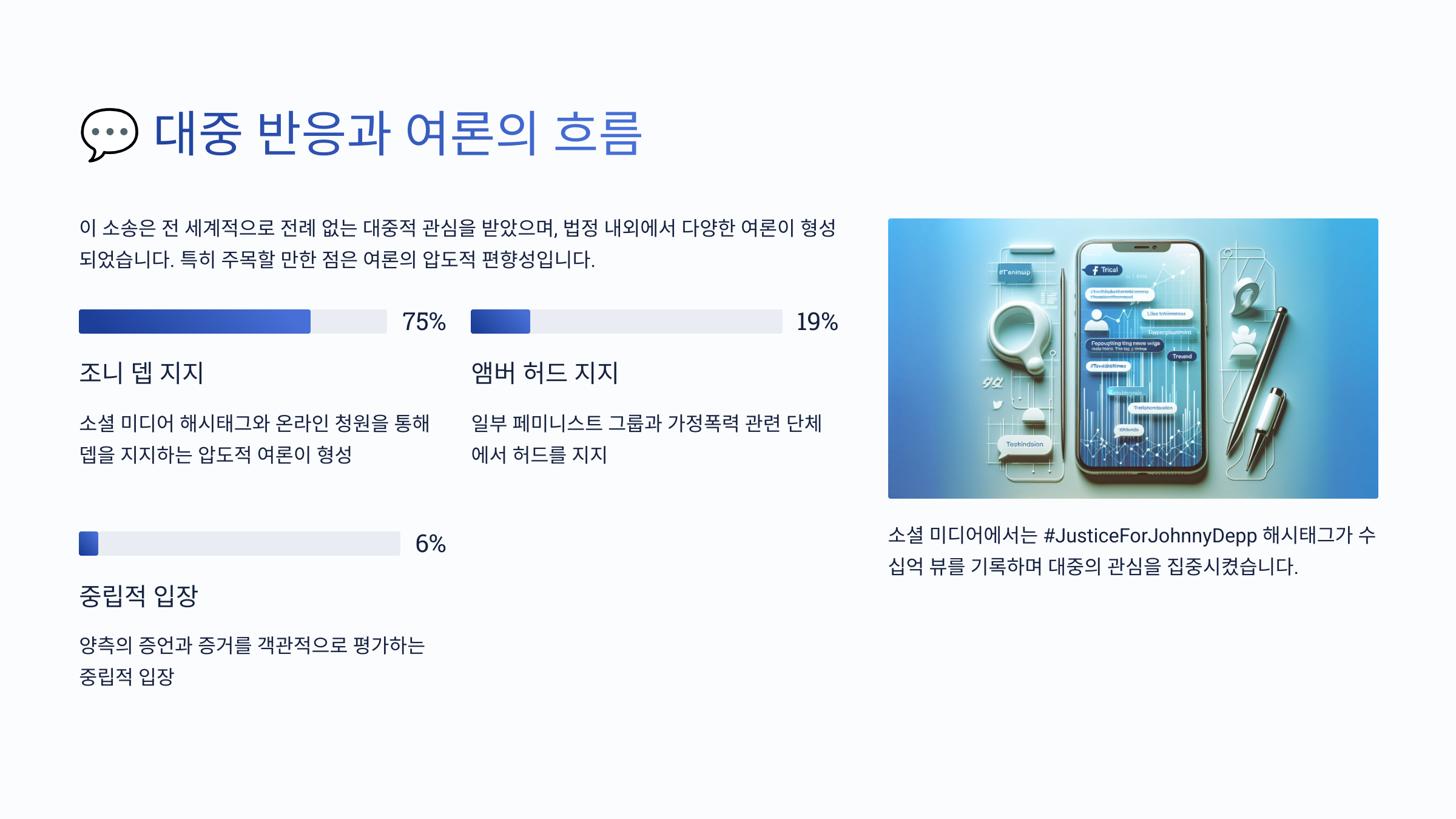 여론은 이 재판을 공정하게 바라보기보다는, 감정적으로 편향된 채로 흘러갔어요. 대중은 조니 뎁을 오랫동안 사랑해왔고, 그의 이미지에 이미 정서적 애착이 형성되어 있었기 때문에, 그의 말은 더 신뢰받았죠.