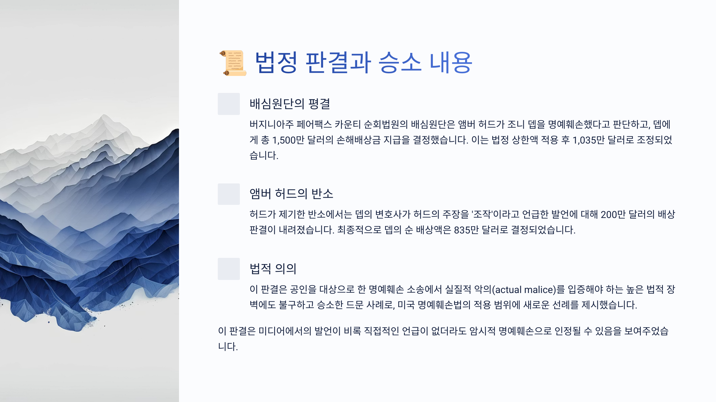 앰버 허드와 조니 뎁의 재판은 단순한 유명인의 싸움이 아니라, 우리가 어떻게 진실을 판단하고 소비하는지를 보여주는 거울 같은 사건이었어요. 이 사건은 대중, 언론, 법, SNS, 팬덤, 젠더 이슈, 표현의 자유까지 수많은 사회적 메시지를 남겼어요.