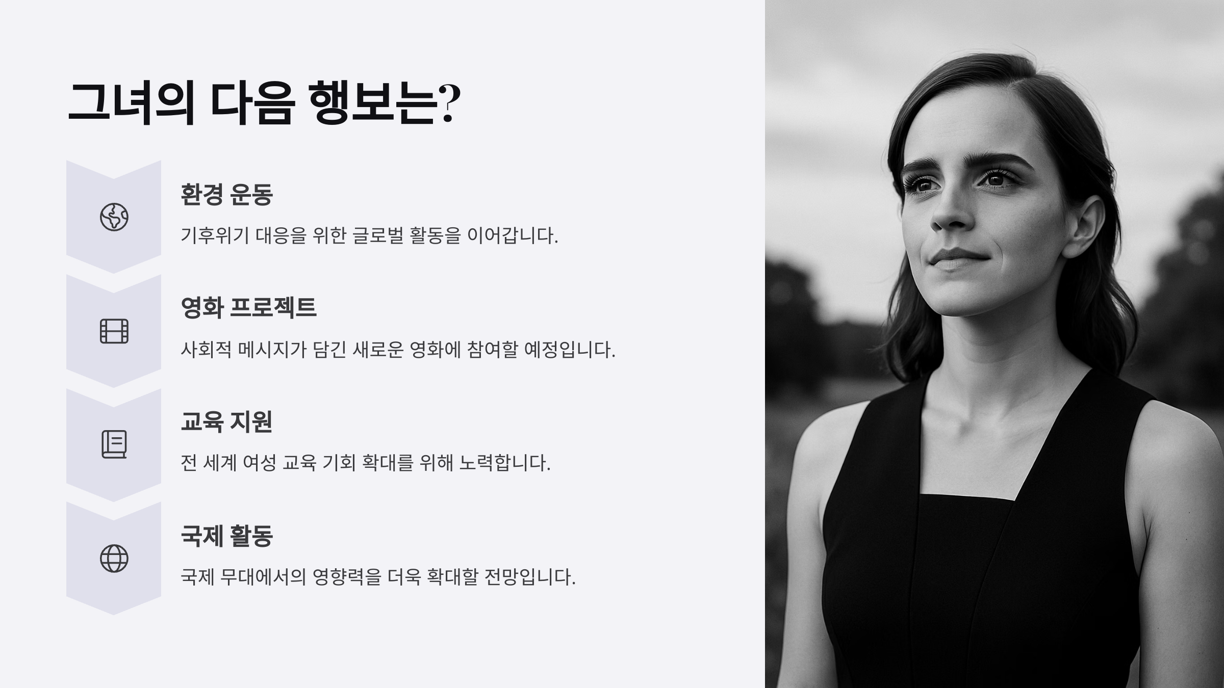 에마 왓슨은 지금까지도 놀라운 길을 걸어왔지만, 2025년 현재 그녀의 활동은 더욱 넓어지고 있어요. 이제는 단순한 배우, 활동가를 넘어 글로벌 영향력을 가진 ‘지속 가능성 설계자’로 평가받고 있답니다.