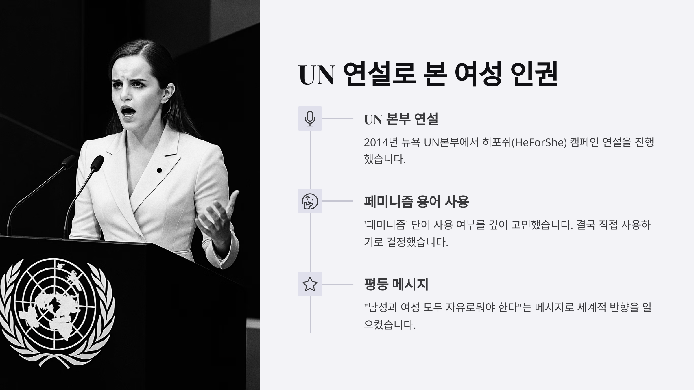 에마 왓슨의 가장 강력한 인권 메시지 중 하나는 2014년 UN 본부에서 열린 'HeForShe' 캠페인 런칭 연설이에요. 이 연설은 전 세계 수백만 명에게 감동을 주며, 그녀를 사회 운동가로서 자리매김하게 했답니다.