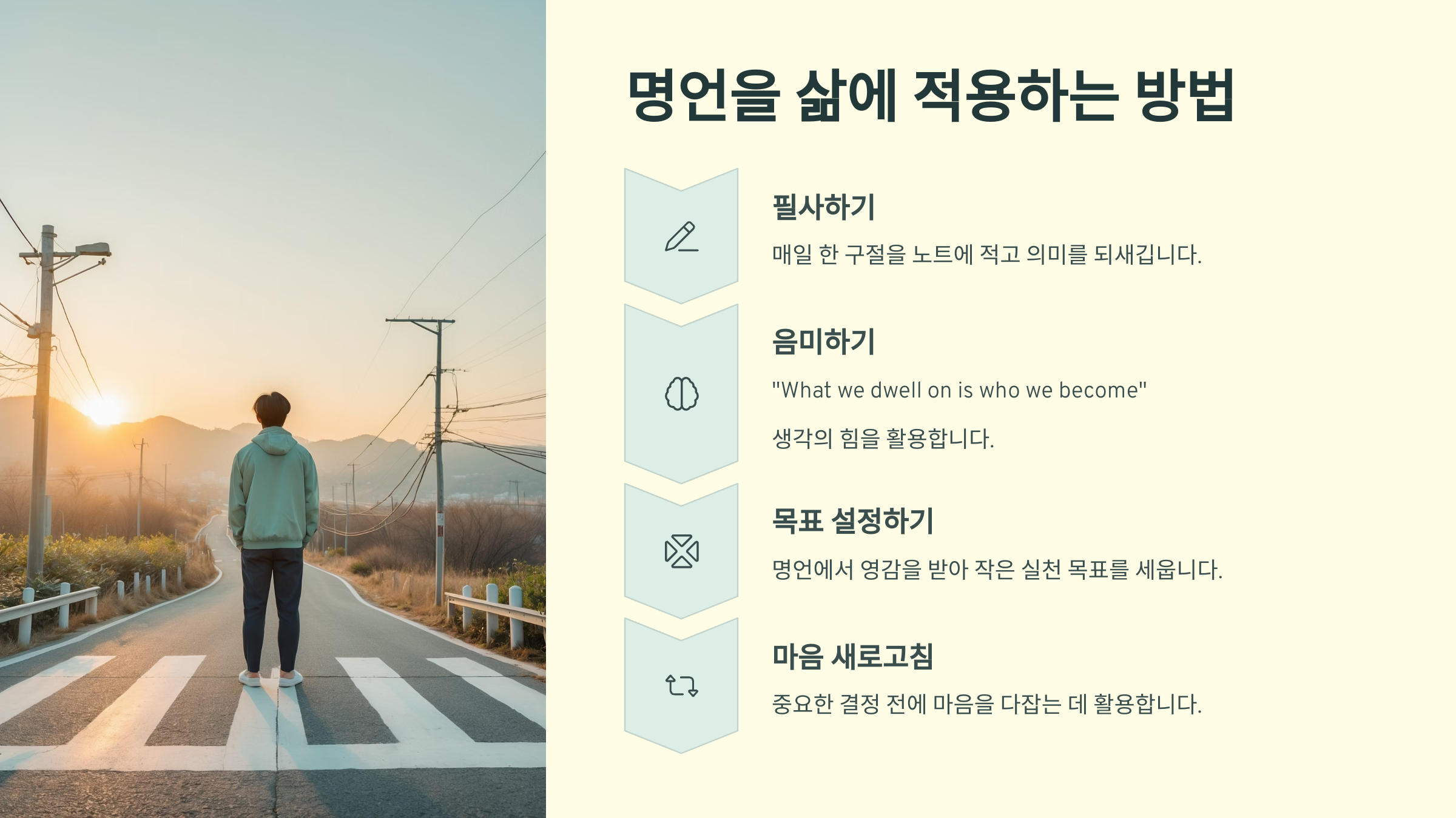 이런 식으로, 명언은 ‘생각’에서 시작되지만, ‘행동’과 연결될 때 비로소 나를 변화시켜요. 손으로 쓰고, 말로 내뱉고, 몸으로 실천하는 것이 핵심이에요.