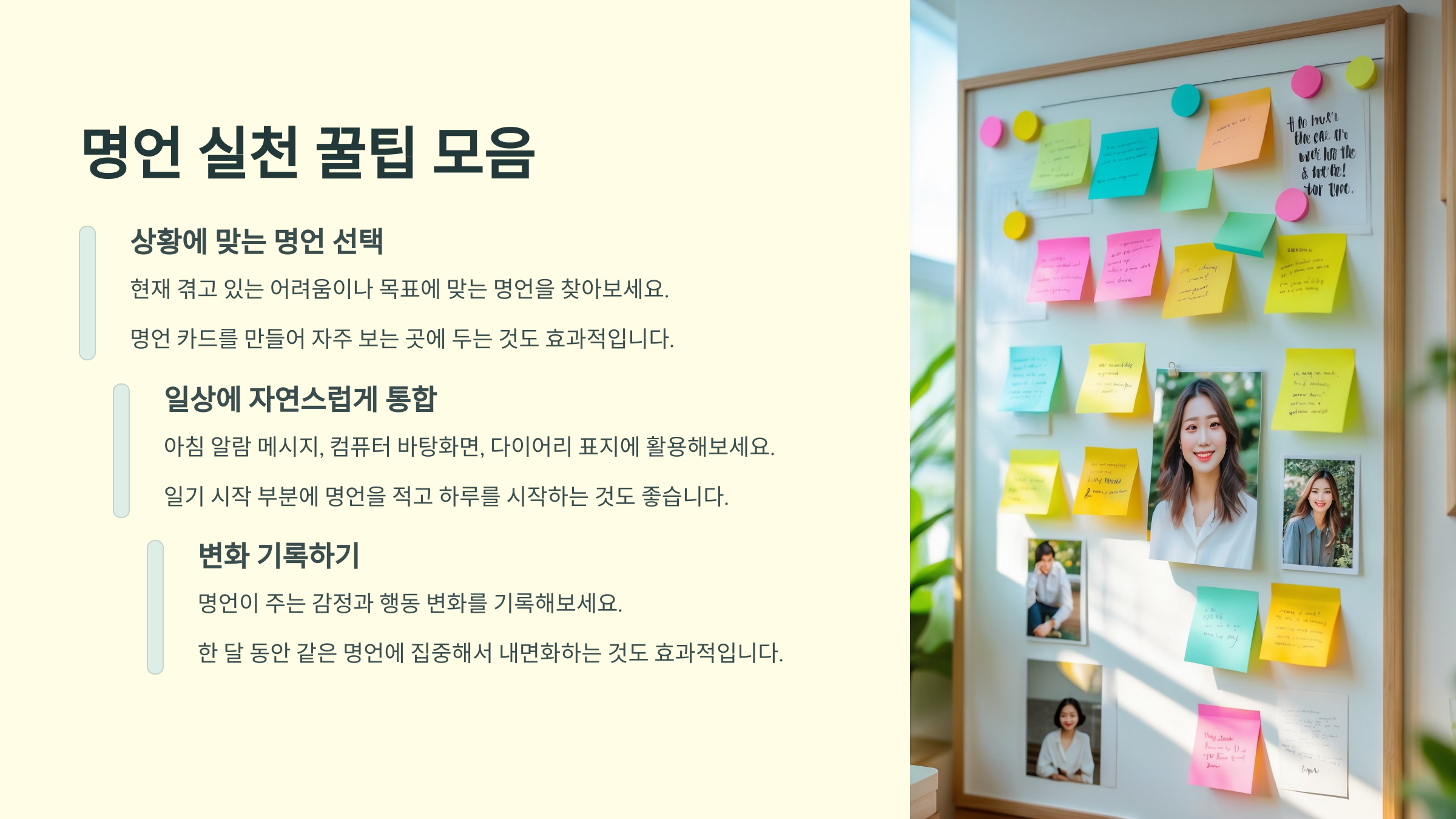 명언은 우리의 무의식을 새롭게 설계하는 강력한 도구예요. 실천 없이는 단지 ‘좋은 말’일 뿐이지만, 실천하면 그것이 ‘내 인생의 철학’이 되죠.