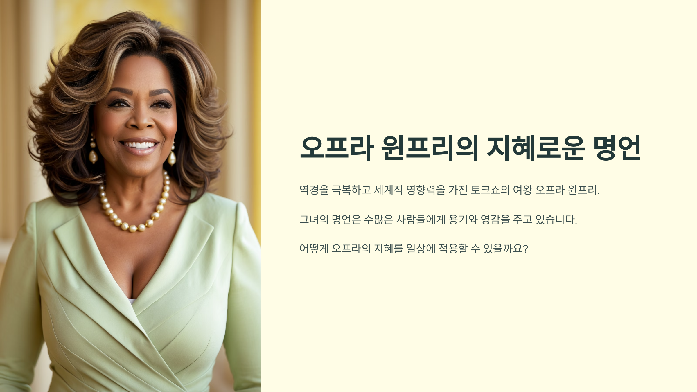 오프라 윈프리는 단순한 방송인이 아니에요. 그녀는 말 한마디로 사람의 마음을 움직이고 삶을 바꾸는 놀라운 영향력을 지닌 인물이랍니다. 오프라가 던진 수많은 명언들은 전 세계 수백만 명에게 용기와 희망을 줬어요.