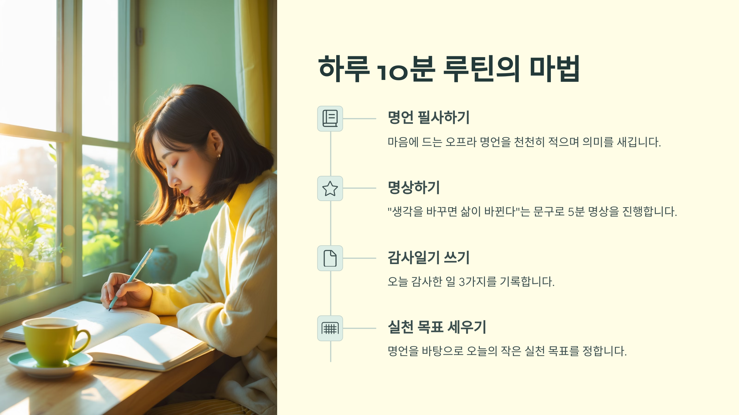 오프라 명언은 이처럼 구체적인 삶의 변화로 이어질 수 있어요. 하루 10분이 인생의 흐름을 바꾸는 시작점이 된 거죠.