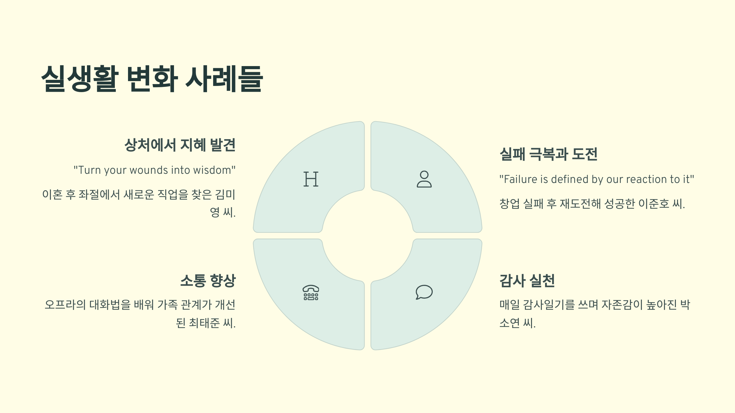 첫 번째 사례는 30대 직장인 ‘지현’ 씨예요. 매일 출근길이 지옥 같았다는 그녀는 “나 자신을 믿어야 한다”는 오프라 명언을 매일 되새겼어요. 3개월이 지나자 그녀는 퇴근 후 자기계발 책을 읽고, 결국 이직에 성공했답니다.