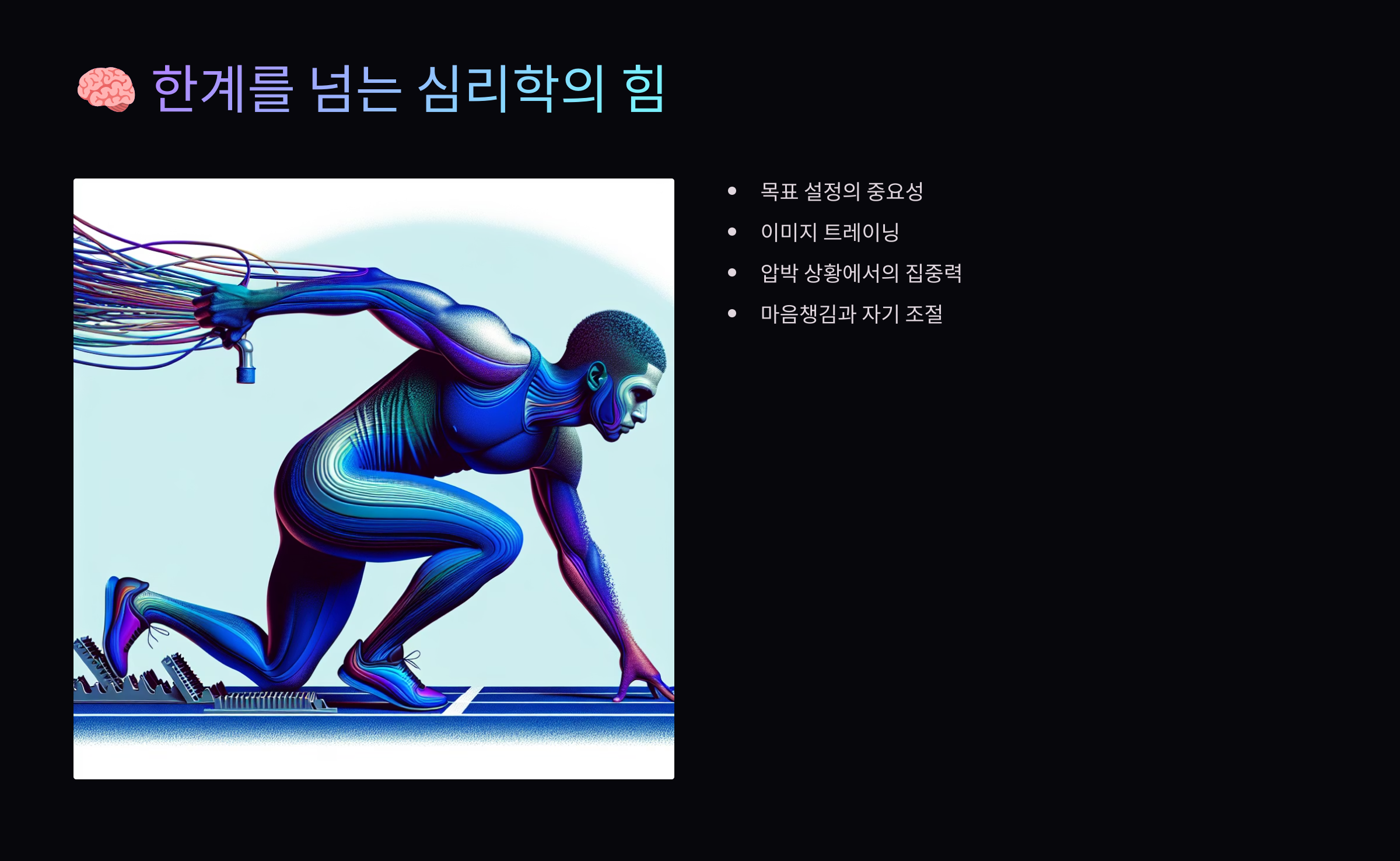스프린터의 속도는 몸뿐 아니라 ‘마음’에서도 비롯돼요. 특히 100m 경기는 몇 초 만에 끝나는 만큼, 집중력과 멘탈 컨트롤이 엄청나게 중요한 종목이에요. 심리 상태가 기록에 직접 영향을 주는 대표적 스포츠죠. ⏱️