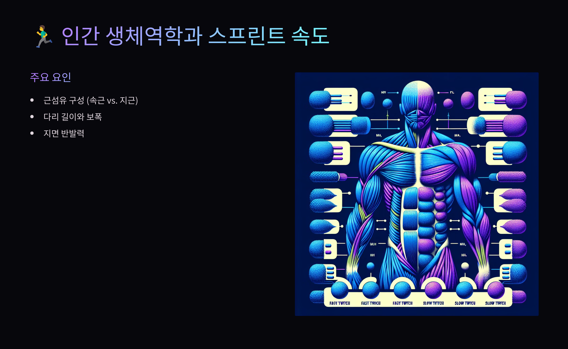 우선, 빠른 스프린터는 대부분 ‘속근’이 많아요. 속근은 짧은 시간 동안 강한 힘을 내는 근섬유로, 장거리 주자보다 폭발적인 힘을 낼 수 있어요. 볼트의 경우 이 속근 비율이 80% 이상으로 추정돼요.