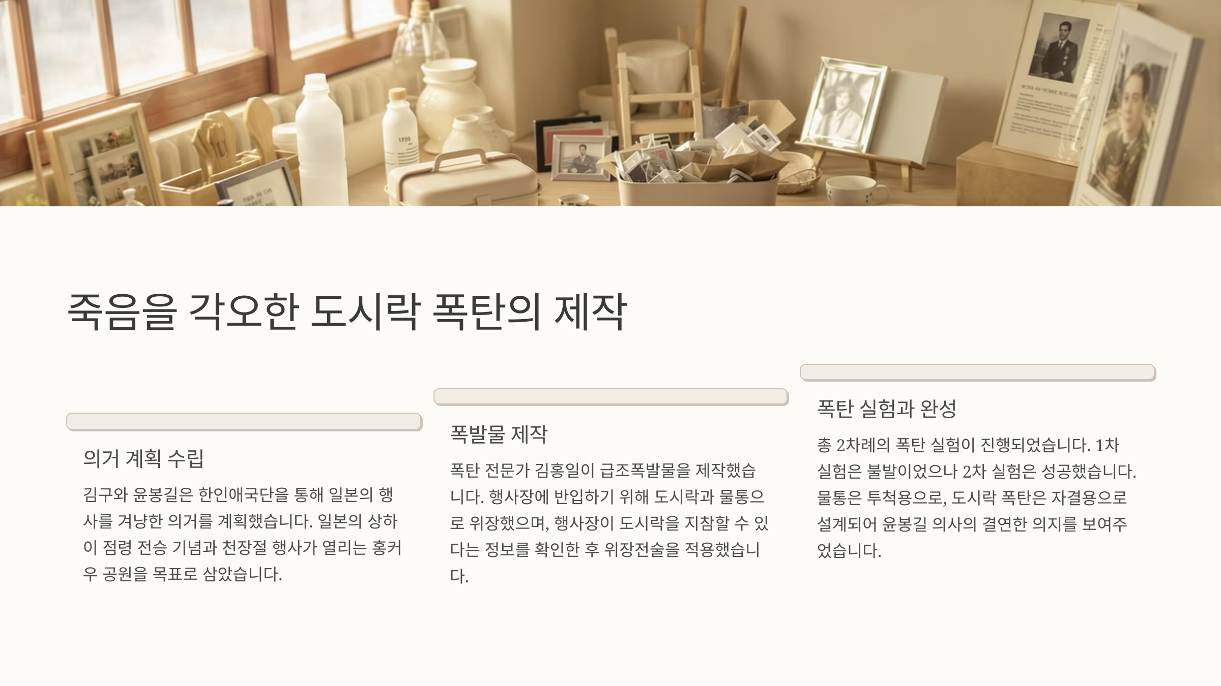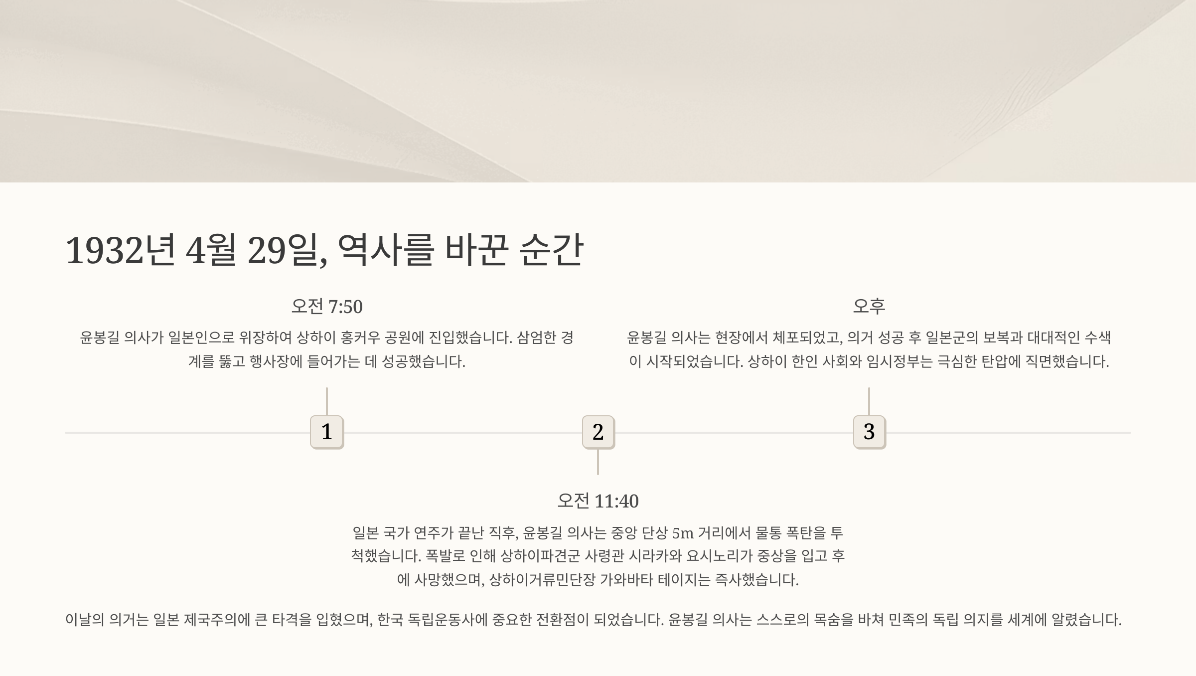 의거 전날까지 윤 의사는 상하이 외곽에 머무르며 투척 연습과 일본어 문장 암기를 병행했어요. 행사장에 자연스럽게 접근하려면 언어와 행동 모두 완벽해야 했으니까요. 그는 행사장에서 ‘만세’를 외치며 도시락을 무대 쪽으로 던졌고, 강렬한 폭음과 함께 사건이 벌어졌어요.