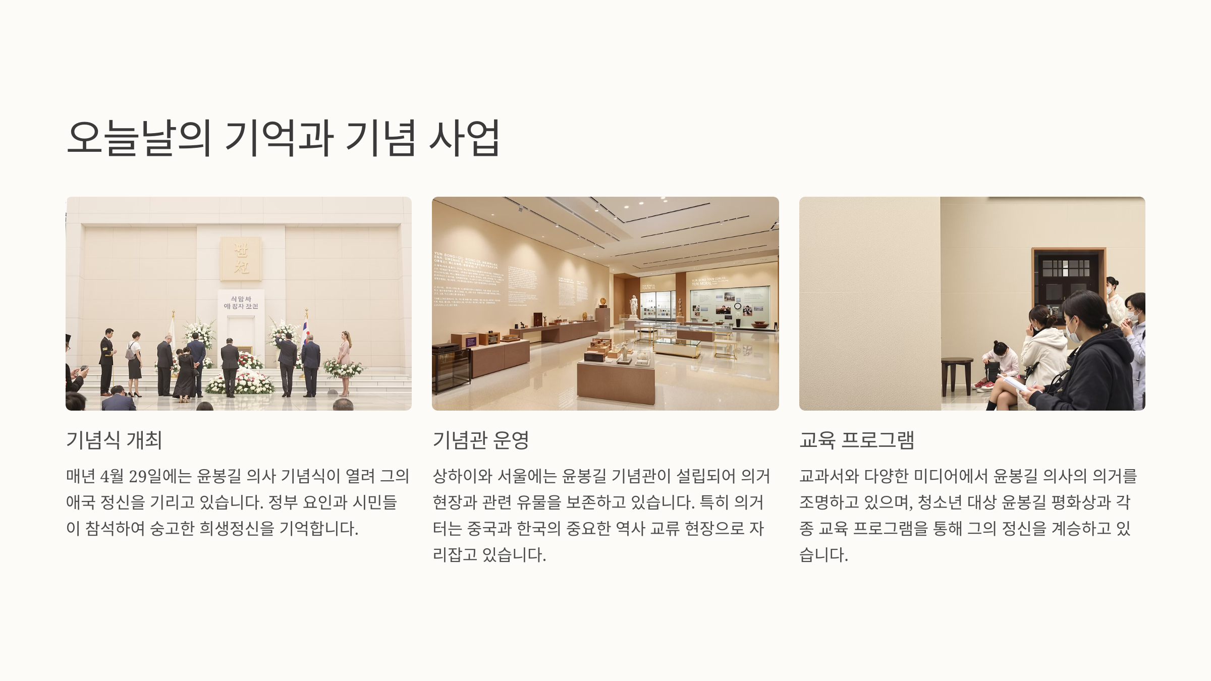 또한 대한민국 교육부는 윤봉길 의사의 의거를 한국사 교과서에 더욱 비중 있게 다루며, 학생들이 단순한 역사 지식이 아닌, 인물의 신념과 철학을 배우도록 지도하고 있어요. 그의 편지와 유언장은 여전히 많은 학교와 박물관에서 전시되며 강한 감동을 주고 있어요.