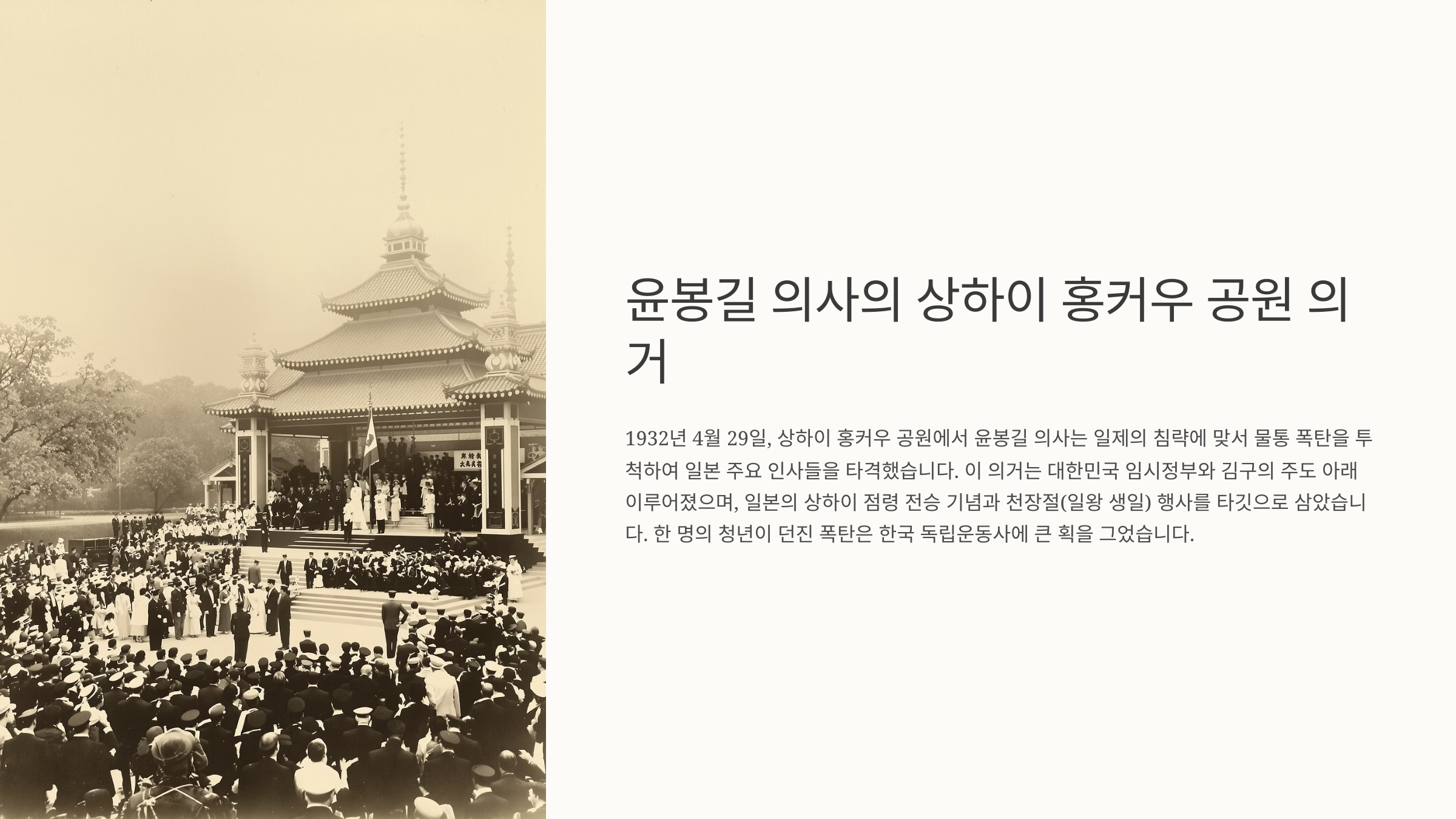 윤봉길 의사의 행동은 ‘폭력’이 아닌 ‘외침’이었어요. 총칼 없이 말로만 외치던 시대에서, 그는 몸으로 외친 것이고, 그 외침은 국경을 넘어 세상에 울려 퍼졌죠.