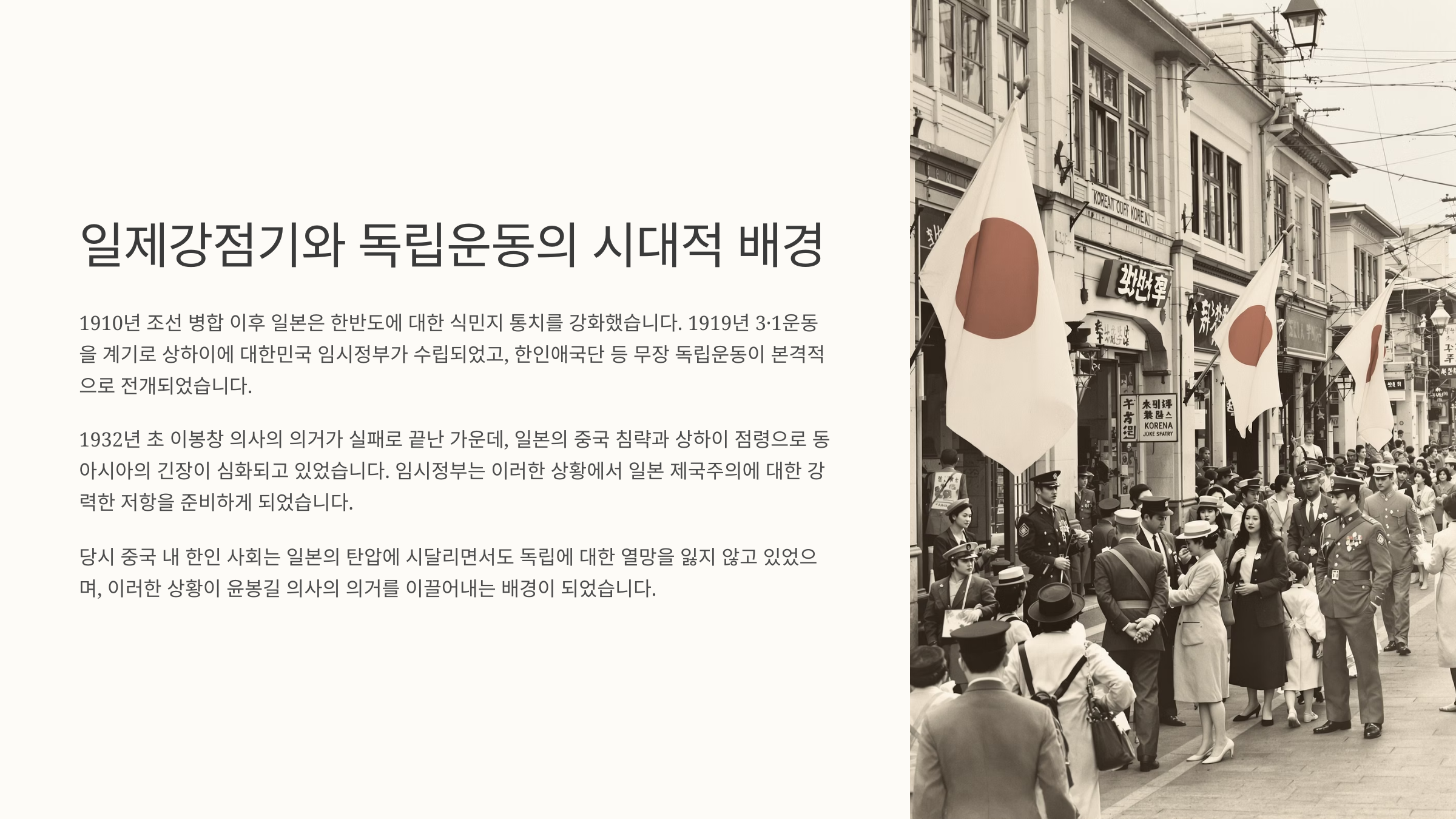윤봉길 의사의 의거가 벌어지던 1932년은 조선이 일본에 강제 병합된 지 22년째 되는 해였어요. 당시 조선은 정치, 경제, 문화 전 분야에서 일본의 철저한 통제를 받으며 독립운동이 점점 더 억압되고 있었죠. 하지만 민족의 자주권을 되찾기 위한 노력은 멈추지 않았어요.