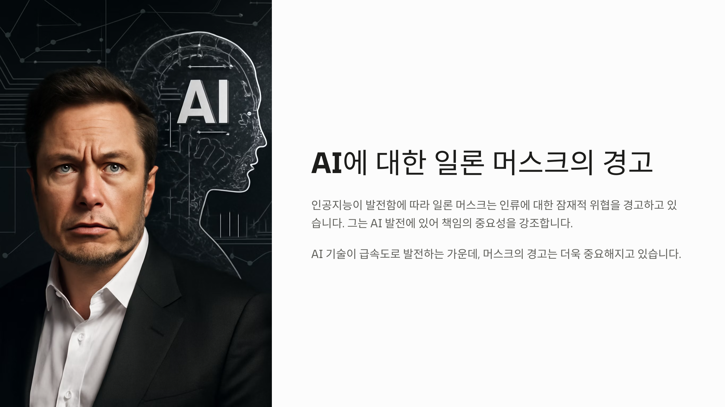 그래서 그는 기술 그 자체보다도, 인간의 탐욕과 무책임이 더 무섭다고 말한 거예요. AI는 결국 도구일 뿐이고, 그 도구를 어떻게 쓰느냐는 인간에게 달려 있으니까요. 머스크는 이 점을 가장 크게 경고하고 싶었던 거예요.