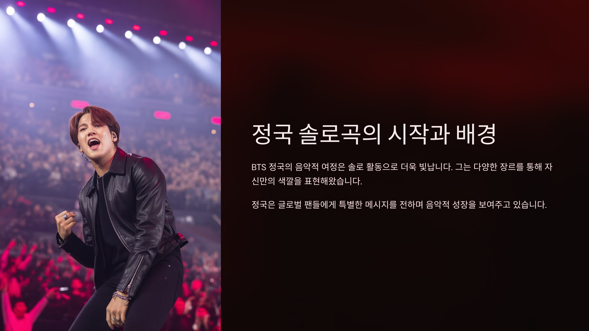정국은 BTS의 메인보컬로서, 뛰어난 가창력과 감미로운 음색으로 전 세계 팬들에게 깊은 인상을 남기고 있어요. 특히 솔로곡에서는 그만의 음악적 감성과 보컬 역량이 한껏 드러나죠.
