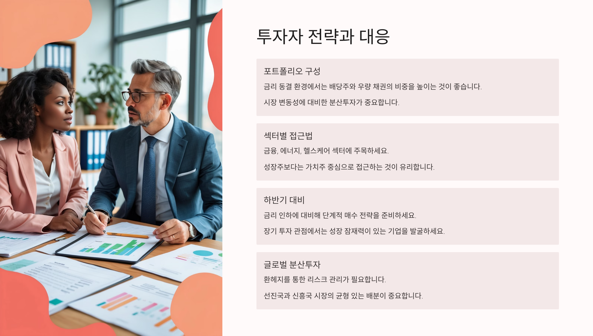 단기적으로는 변동성이 커질 수 있어요. 금리 민감주나 기술주는 추가 조정이 있을 수 있으니, 이런 종목 비중을 조절하는 게 좋아요. 대신 경기 방어주, 필수소비재, 배당주 같은 안정적인 종목을 눈여겨보면 좋아요. 이런 종목들은 경기 둔화 국면에서도 상대적으로 방어력이 좋거든요.