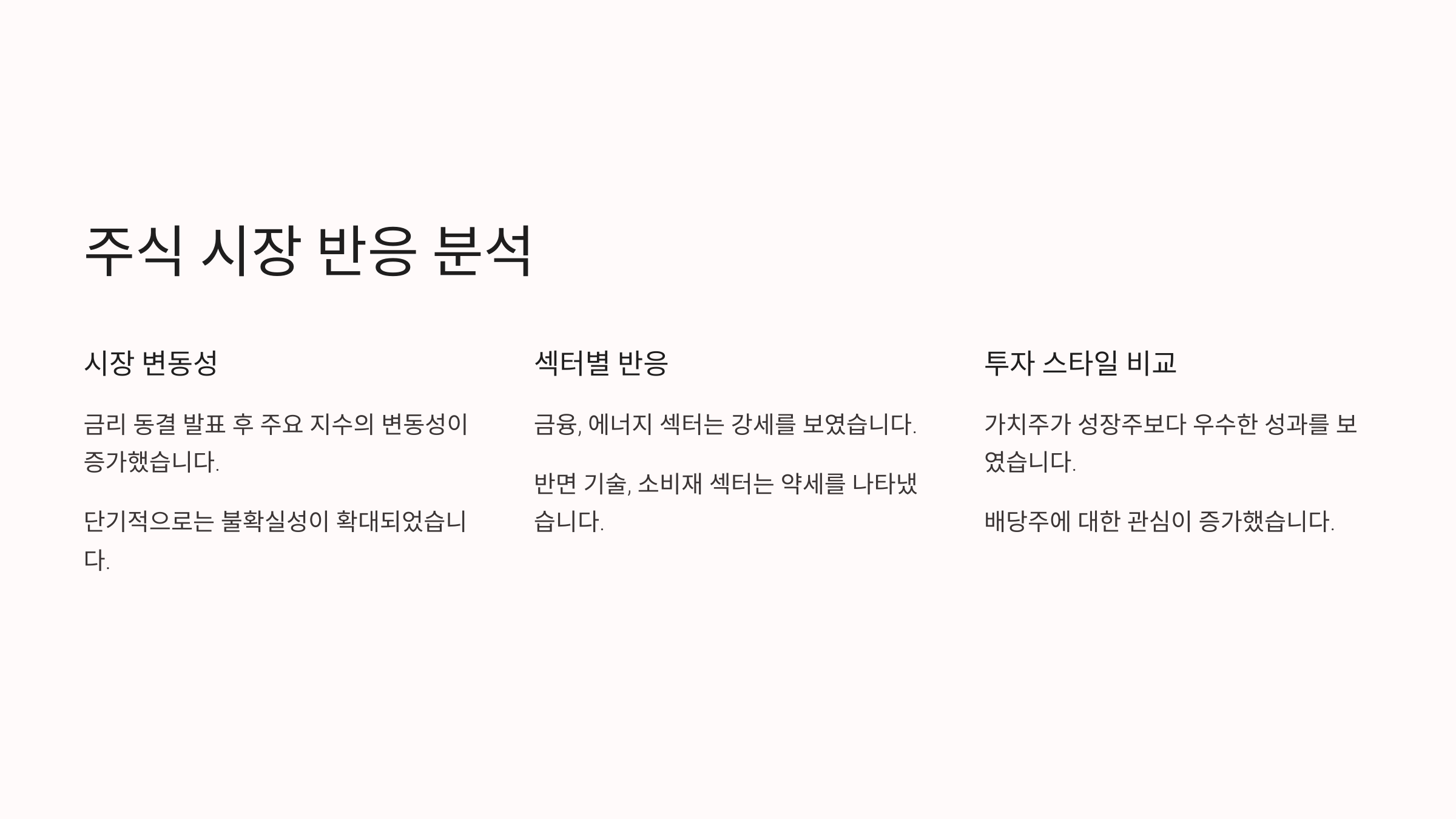 주식 시장에서 가장 큰 영향을 받은 건 금리 민감주였어요. 특히 성장주 투자 비중이 높은 개인 투자자들은 변동성에 적잖이 당황했을 거예요. 하지만 단기적인 충격 이후에는 기업 실적과 경제지표에 따라 다시 안정을 찾을 가능성도 있어요.
