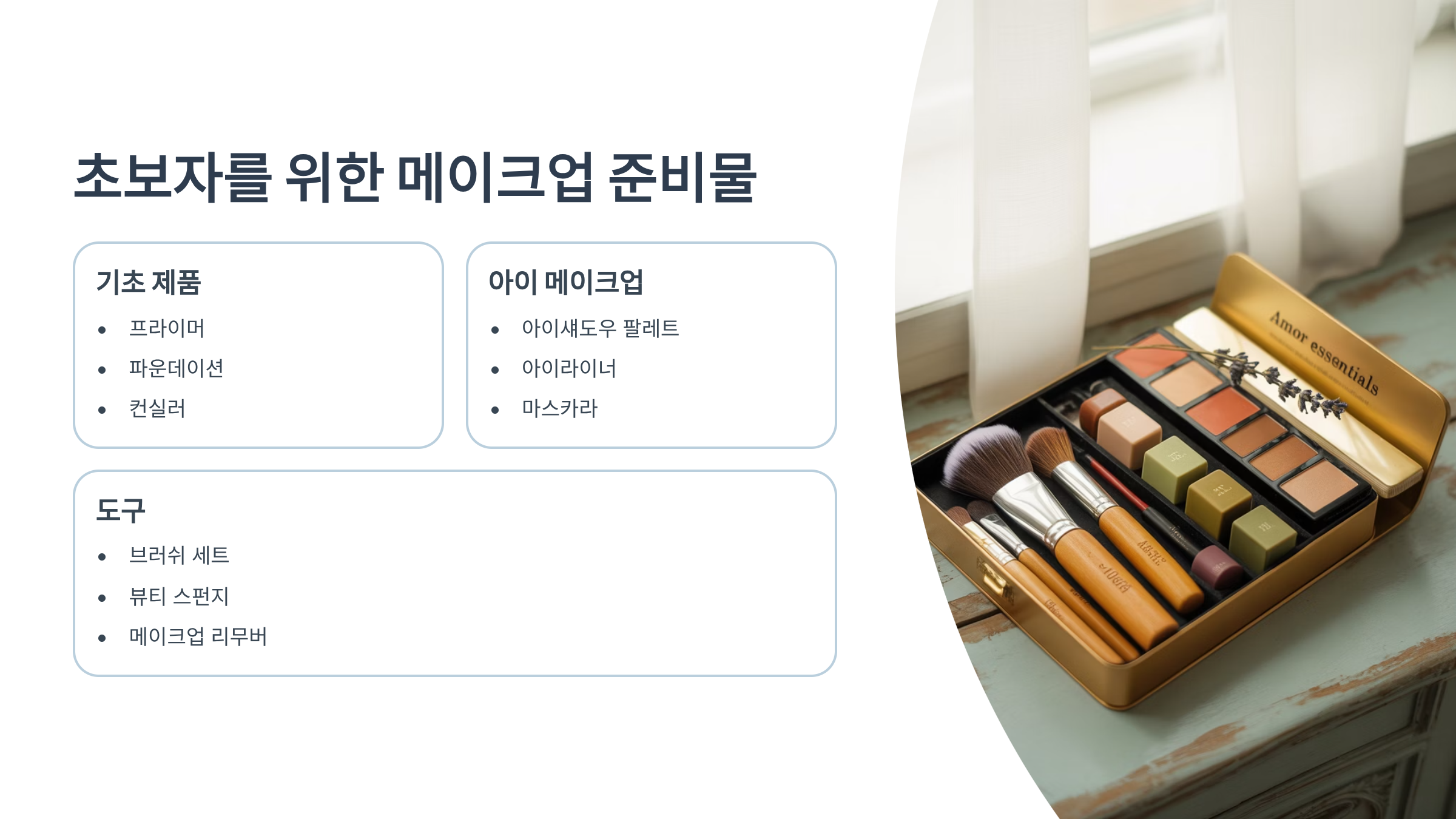필수 준비물은 다음과 같아요. 첫 번째, 파운데이션 또는 비비크림으로 피부를 정돈해주는 제품이에요. 두 번째, 컨실러는 잡티나 다크서클을 가려주는 데 필수죠. 세 번째, 아이섀도 팔레트는 다양한 룩을 연출할 수 있는 핵심 아이템이에요. 초보자일수록 컬러가 다양한 팔레트를 하나쯤 가지고 있는 게 좋아요. 제임스 찰스 팔레트는 그 대표적인 예죠. 💡
