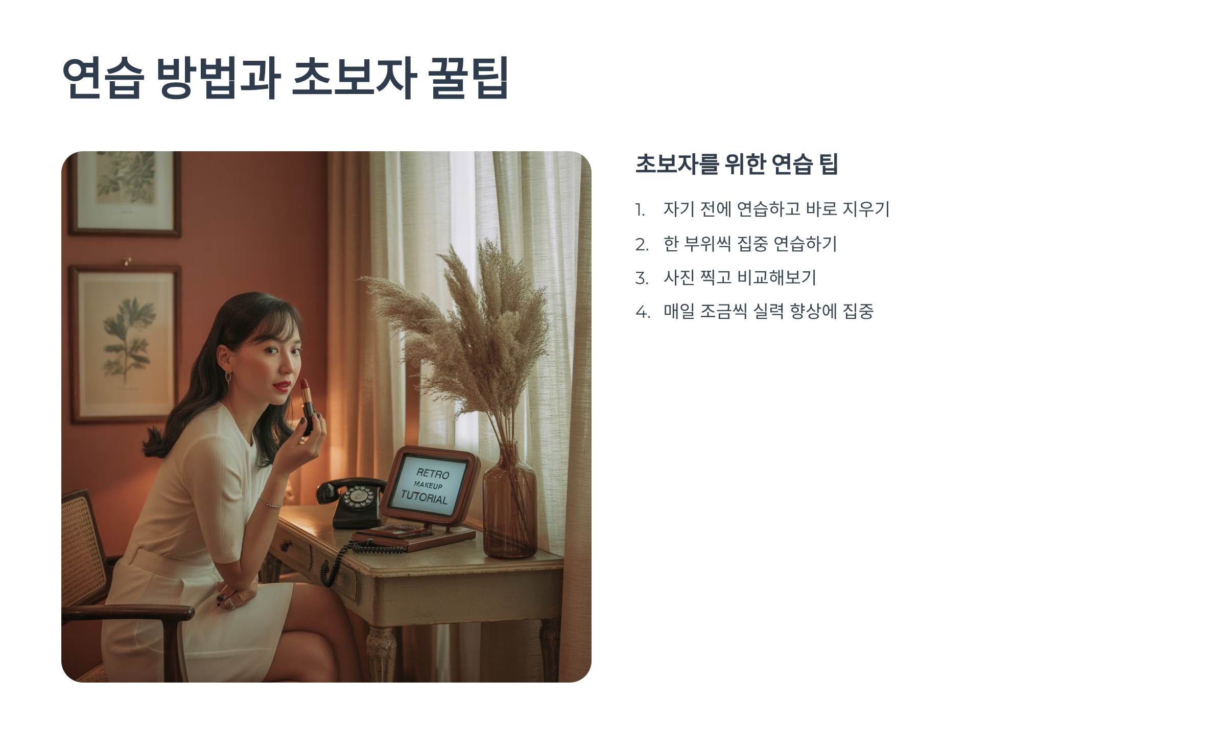 처음엔 거울 앞에서 한쪽 눈만 연습해보는 것도 좋아요. 양쪽을 동시에 하려다 보면 어렵고 시간이 오래 걸릴 수 있거든요. 섀도우 블렌딩, 아이라인 그리기, 립 라인 잡기 등을 각각 나눠서 연습해보면 각 단계별로 실력이 늘어나는 걸 직접 느낄 수 있어요.