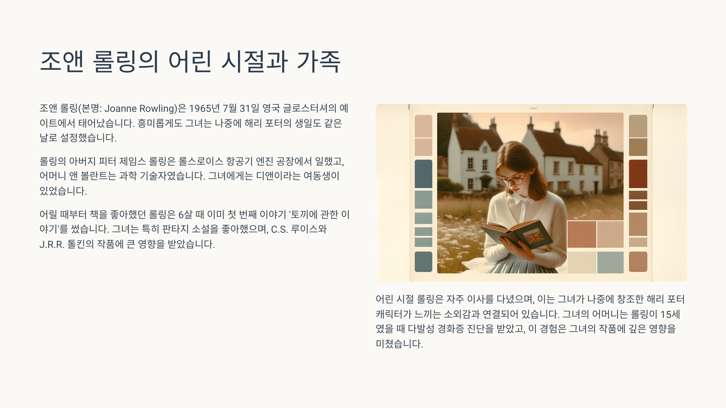 내가 생각했을 때, 조앤의 어린 시절은 단지 평범한 유년기를 넘어서 창의성과 현실 도피가 혼재된 독특한 성장 배경이었어요. 그런 복합적인 요소들이 훗날 ‘해리포터’ 세계관의 토대가 되었던 거죠.