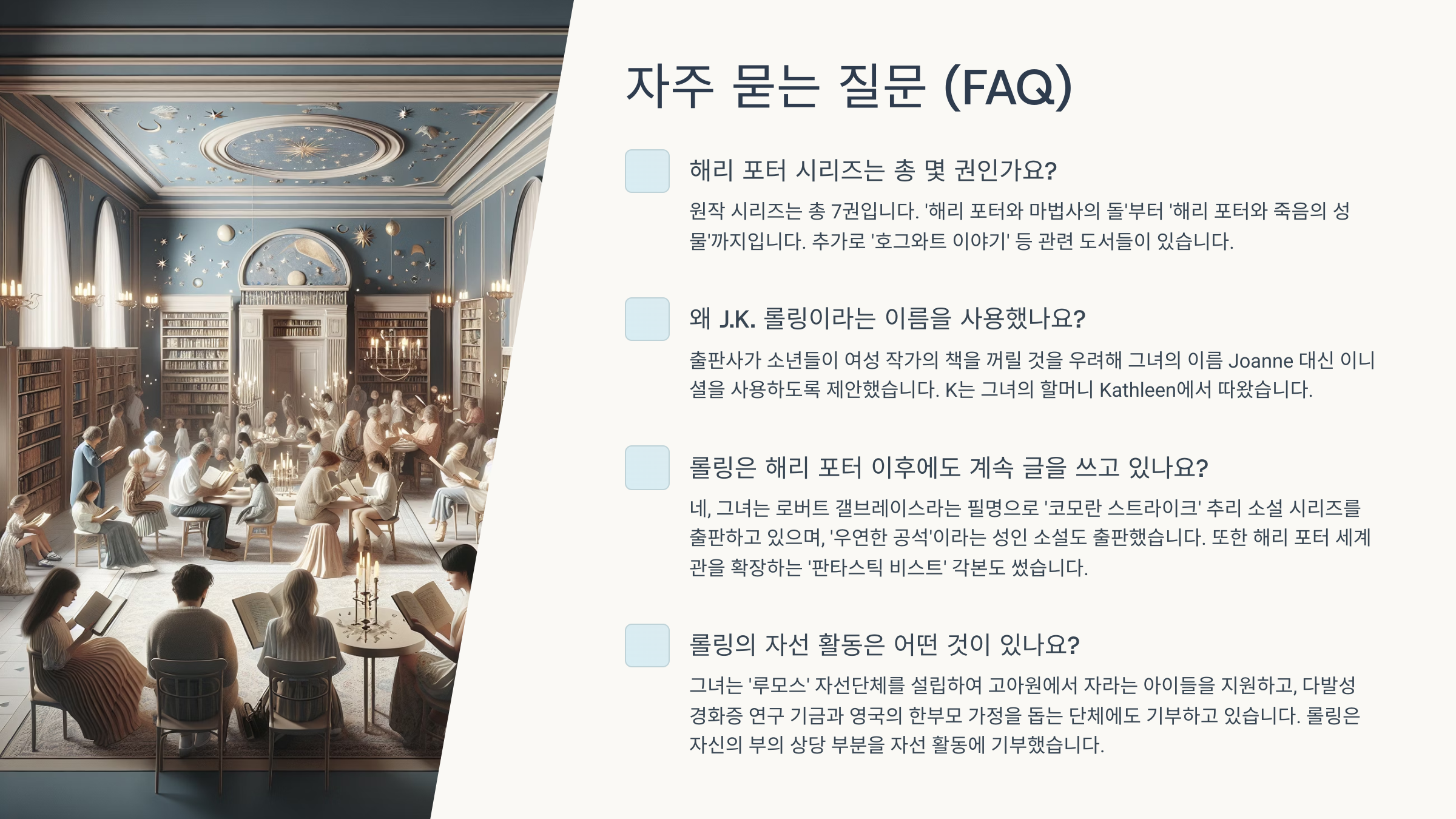 조앤 롤링은 단지 운이 좋았던 작가가 아니에요. 좌절 속에서도 펜을 놓지 않았던 끈기, 수많은 거절을 받아도 포기하지 않았던 용기, 그리고 성공 이후에도 사회를 돌아보는 책임감. 그 모든 요소가 오늘날 그녀를 만들었어요.