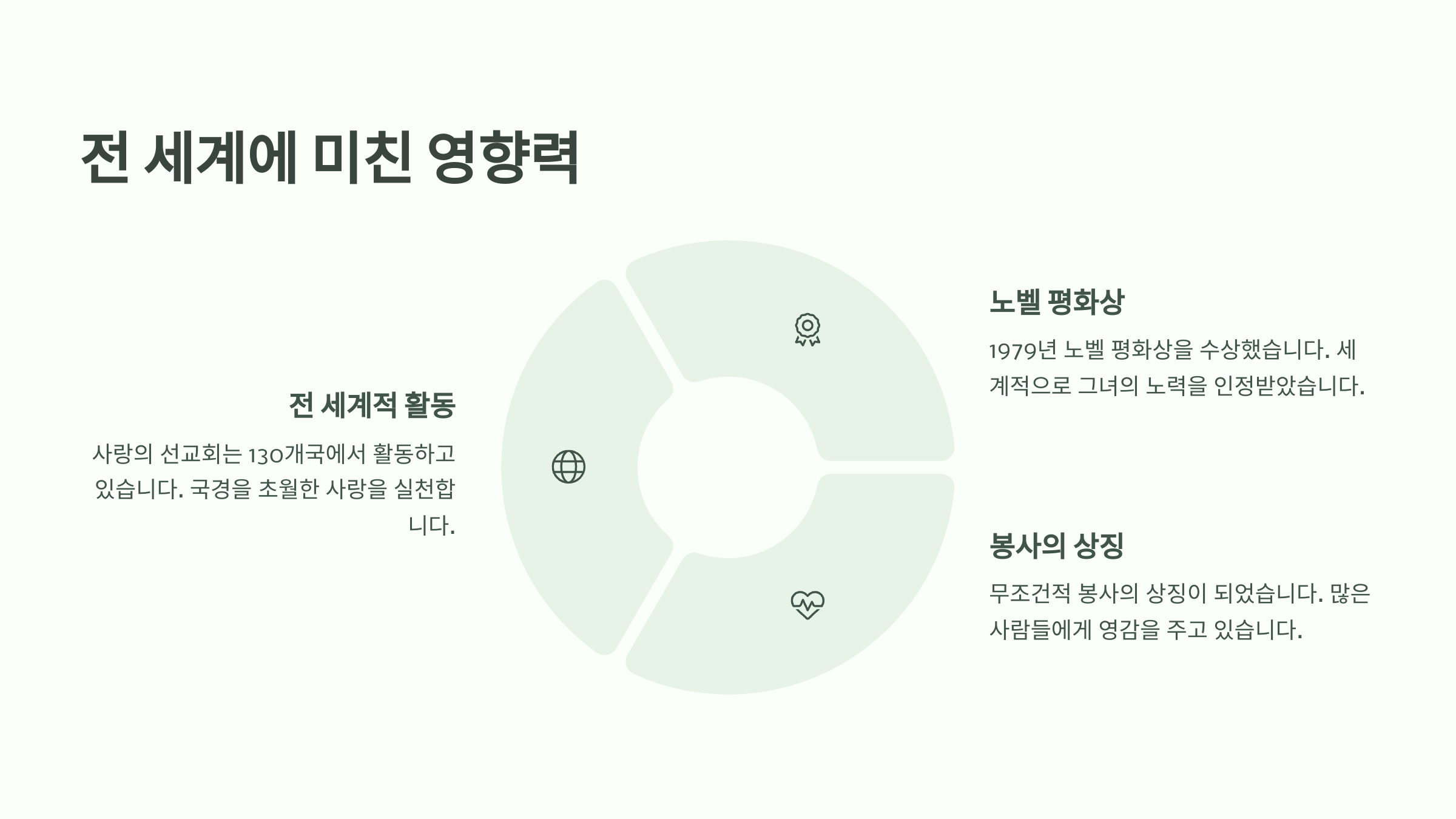 노벨 평화상 수상 이후, 그녀의 사명은 더욱 널리 알려졌고 수많은 자원봉사자와 기부자들이 그녀의 뜻에 동참했어요. 특히 그녀의 무소유 정신은 현대인의 물질 중심적인 삶에 깊은 울림을 줬죠.