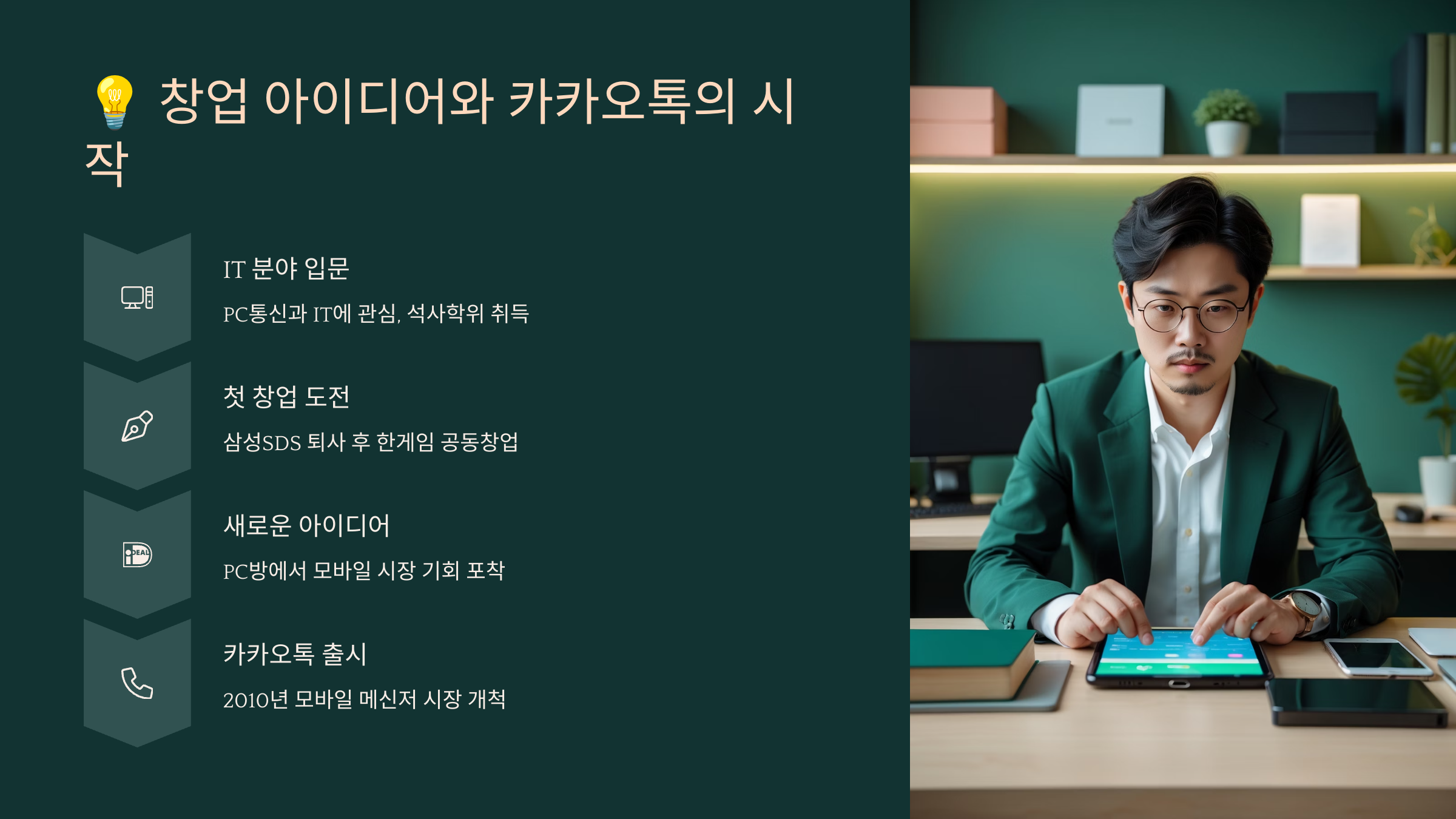 지금부터 김범수의 어린 시절부터 시작해 카카오 창업의 비하인드 스토리, 그리고 그가 꿈꾸는 미래 비전까지 한 번에 살펴보려고 해요.
