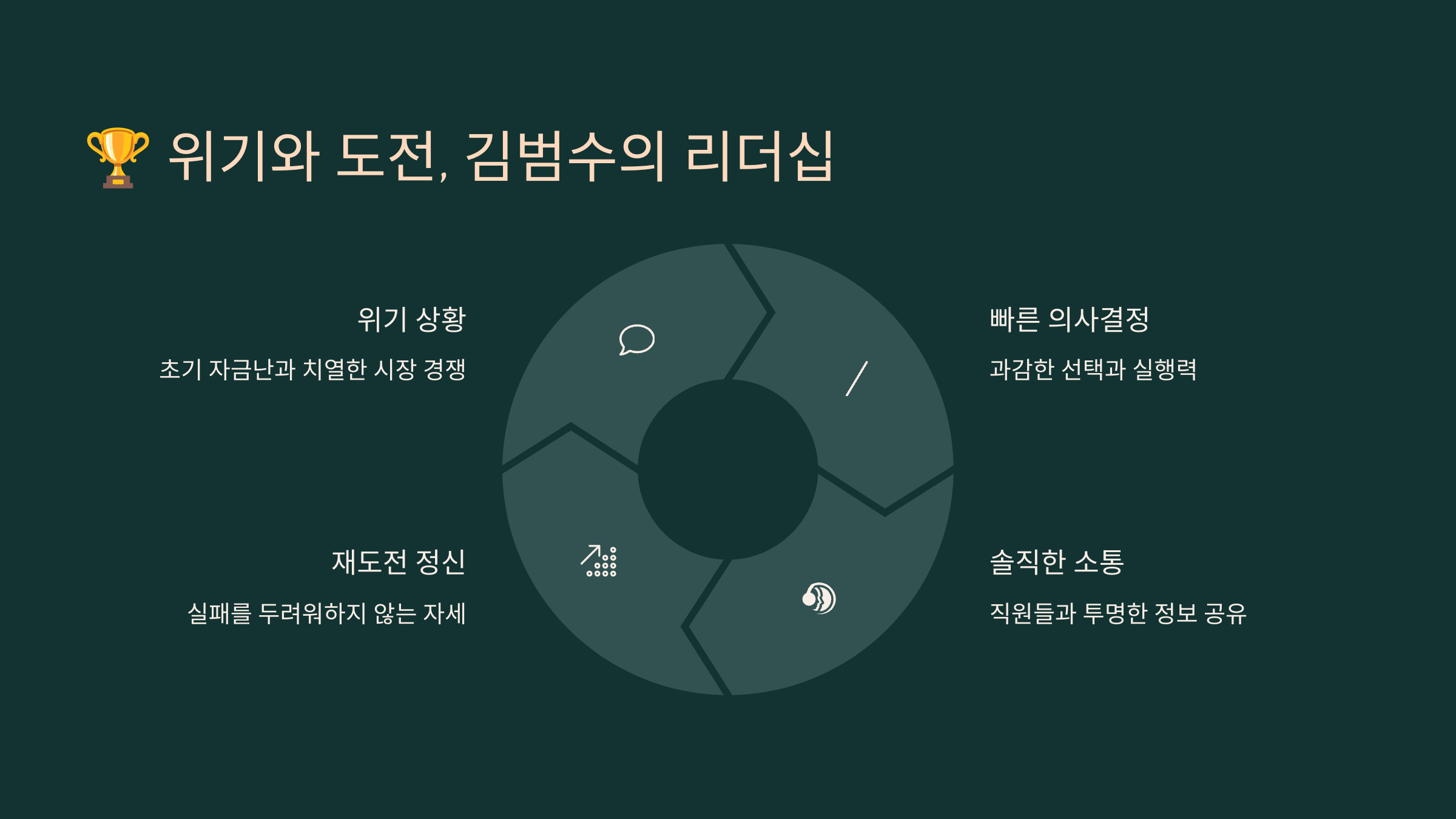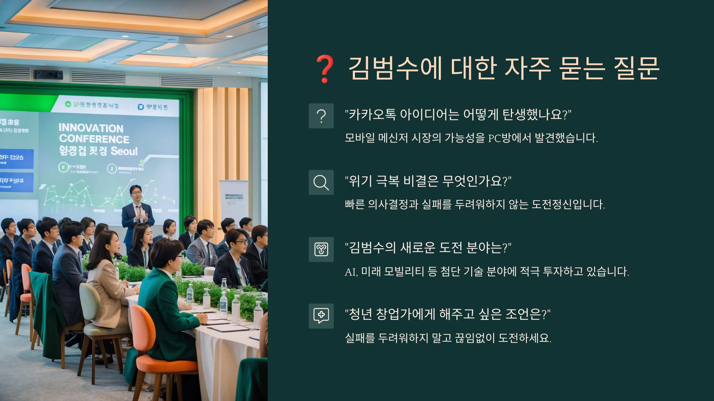 사실 김범수는 사업을 키워가며 여러 위기도 맞았어요. 하지만 그는 위기를 기회로 삼았고, 과감한 인수합병과 새로운 기술투자로 또 다른 길을 열었죠. 그 과정에서 그는 직원들과 함께 고민하며 방향을 정하는 리더로서의 모습도 보여줬어요.