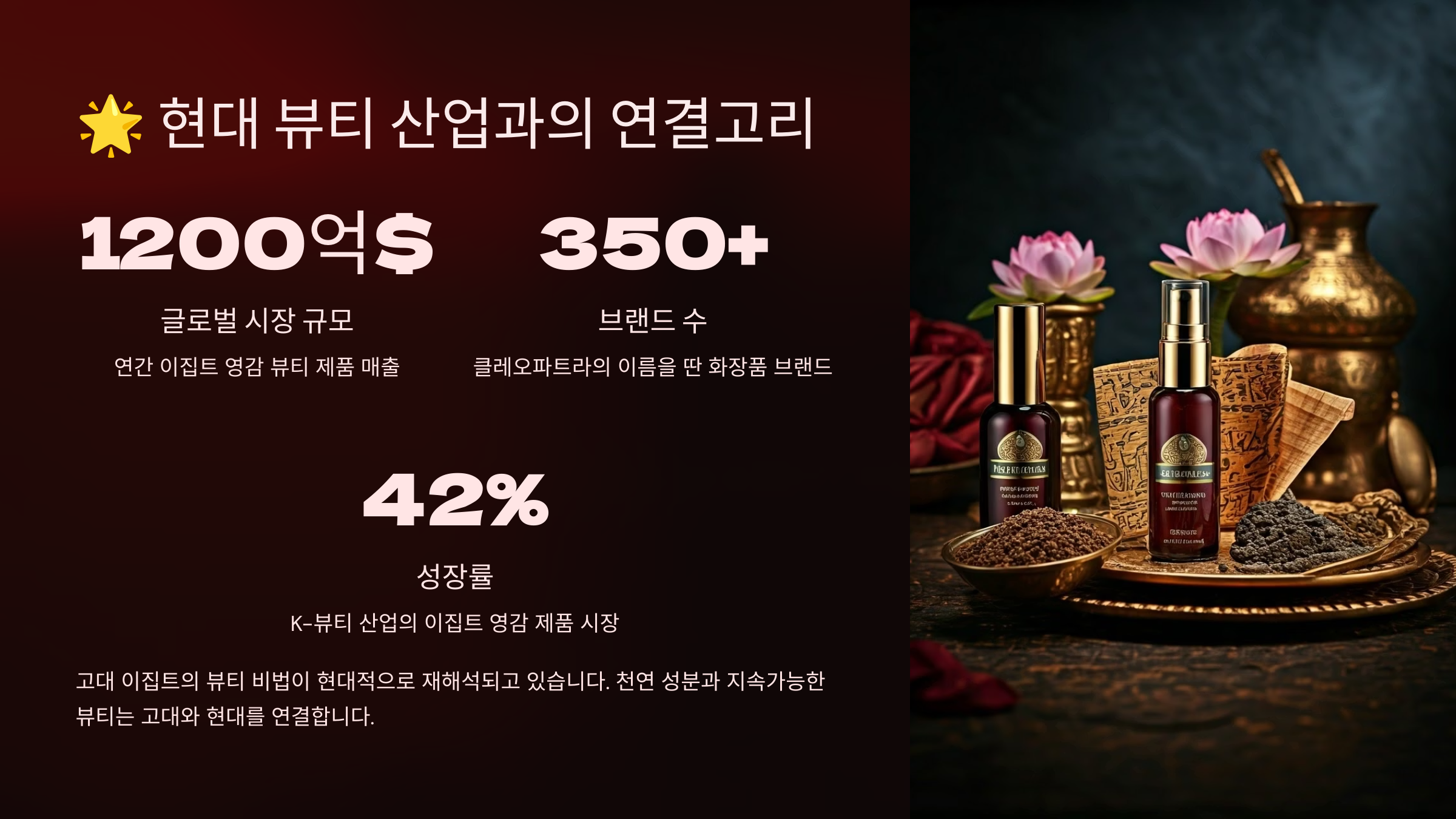 이처럼 클레오파트라는 현대 뷰티 산업에 끊임없는 영감을 제공하고 있어요. 단순한 마케팅이 아니라, '자신을 아름답게 가꾸는 것'이 하나의 자존감 표현이라는 메시지를 담고 있죠.