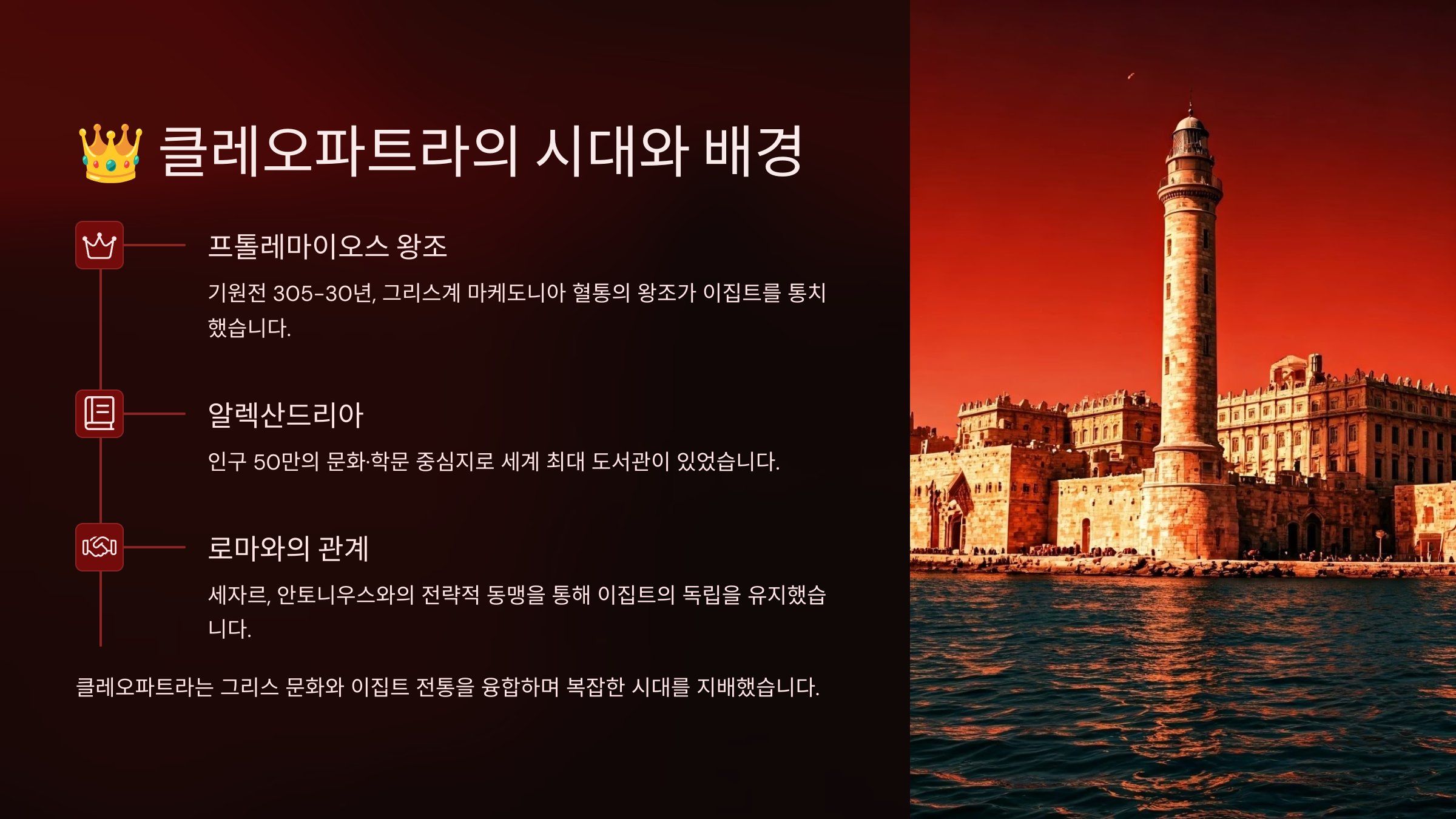 그녀가 살던 시대는 로마와 이집트가 첨예하게 충돌하던 시기였고, 클레오파트라는 그 한가운데에서 국제 정치의 중심축 역할을 해냈죠. 그녀는 알렉산드리아에서 자라나면서 헬레니즘 문화와 이집트 전통을 모두 체득했어요.