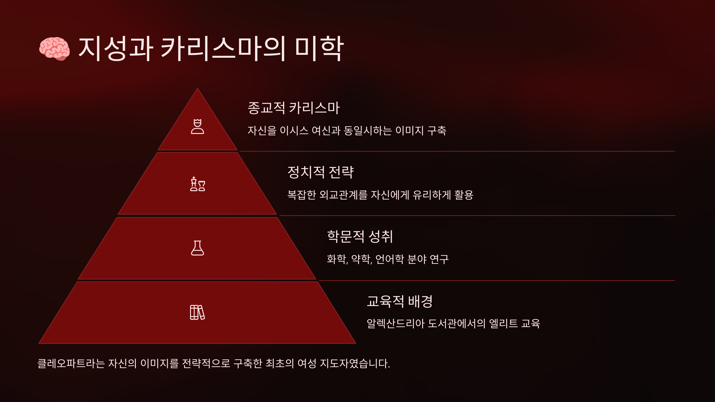 클레오파트라는 단순히 외모만으로 사람을 사로잡은 인물이 아니었어요. 그녀의 진정한 매력은 지성과 카리스마에서 비롯되었답니다. 당시 로마 정치의 중심 인물들이 그녀에게 매료된 이유도 바로 이 때문이었어요.