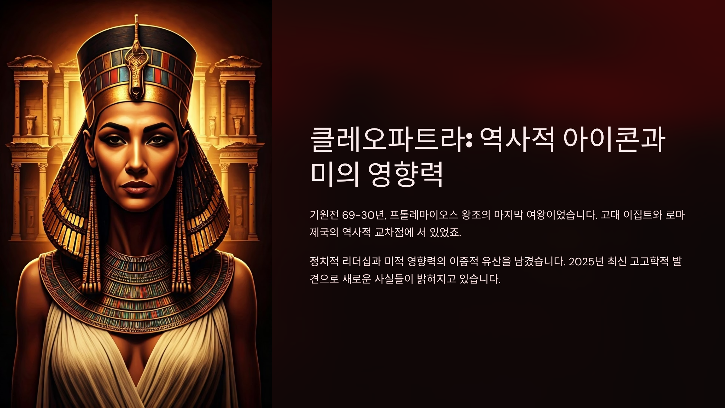 이처럼 클레오파트라는 시대를 초월해 여성의 힘과 아름다움, 정치적 전략을 상징하는 존재로 남게 되었어요. 지금도 많은 사람들은 그녀를 통해 진정한 '미의 힘'이란 무엇인가를 고민하게 되죠.